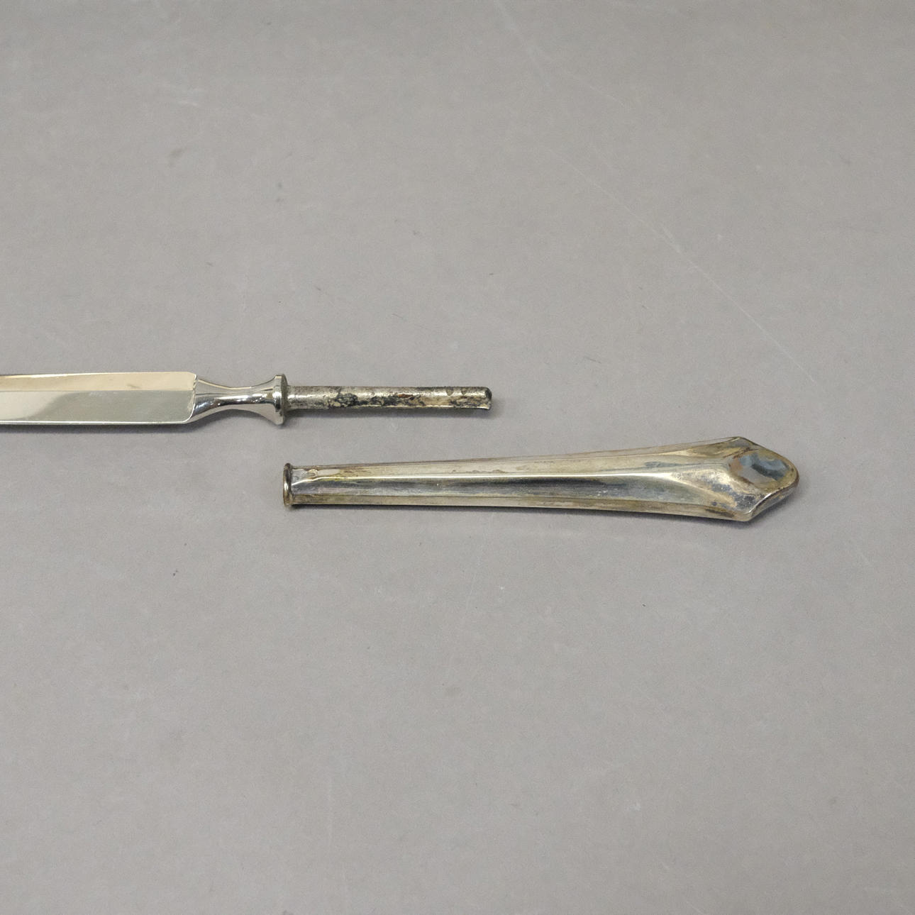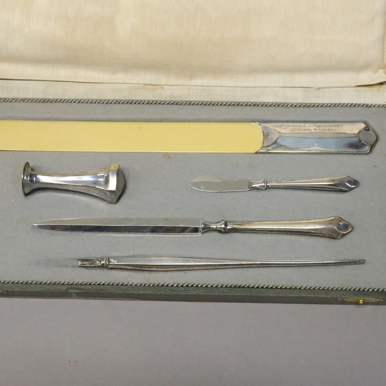 2522572. DESK SET WITH SILVER HANDLE, FIVE PIECES.