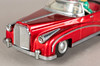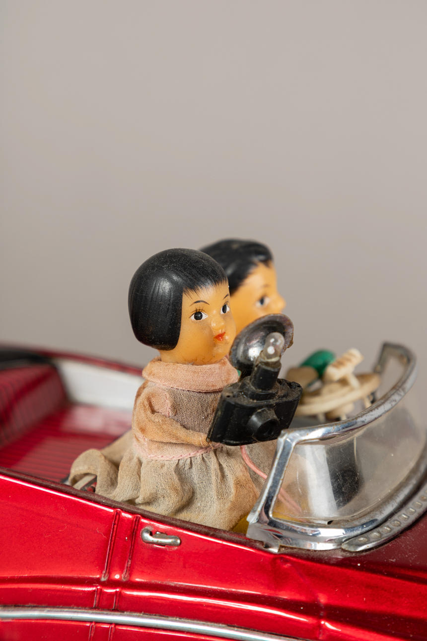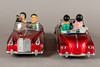 Two battery-powered antique metal cars with a couple of journalists, unmarked, made in China. length approx.: 30 cm.