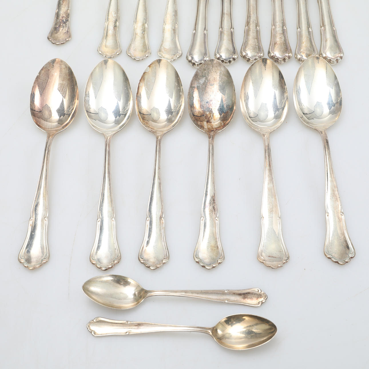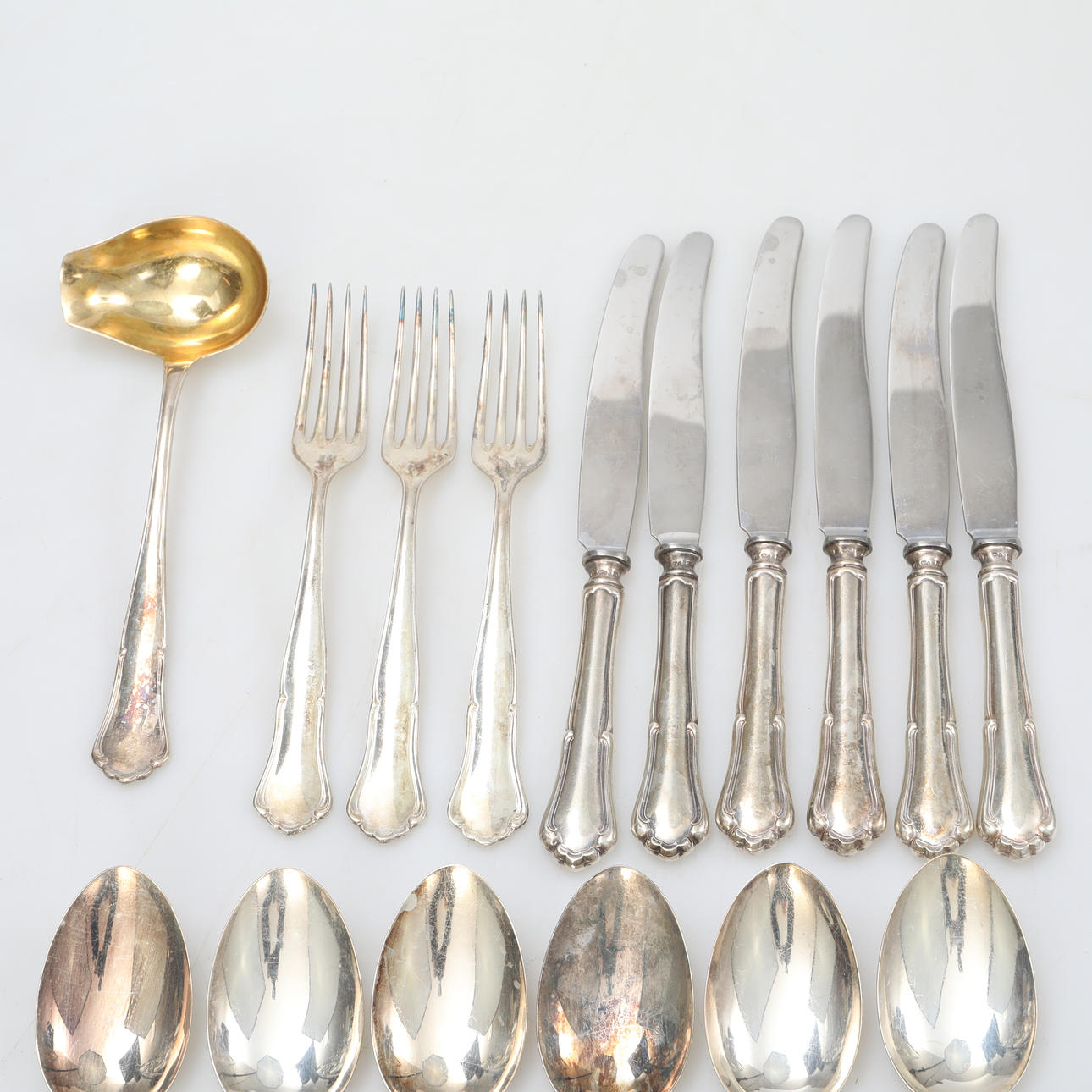 3 forks 18 cm 2 spoons 12.5 cm 6 spoons 18.5 cm 6 knives 21.5 cm (stainless blades) 1 ladle 18 cm Total weight including stainless blades 768 grams.