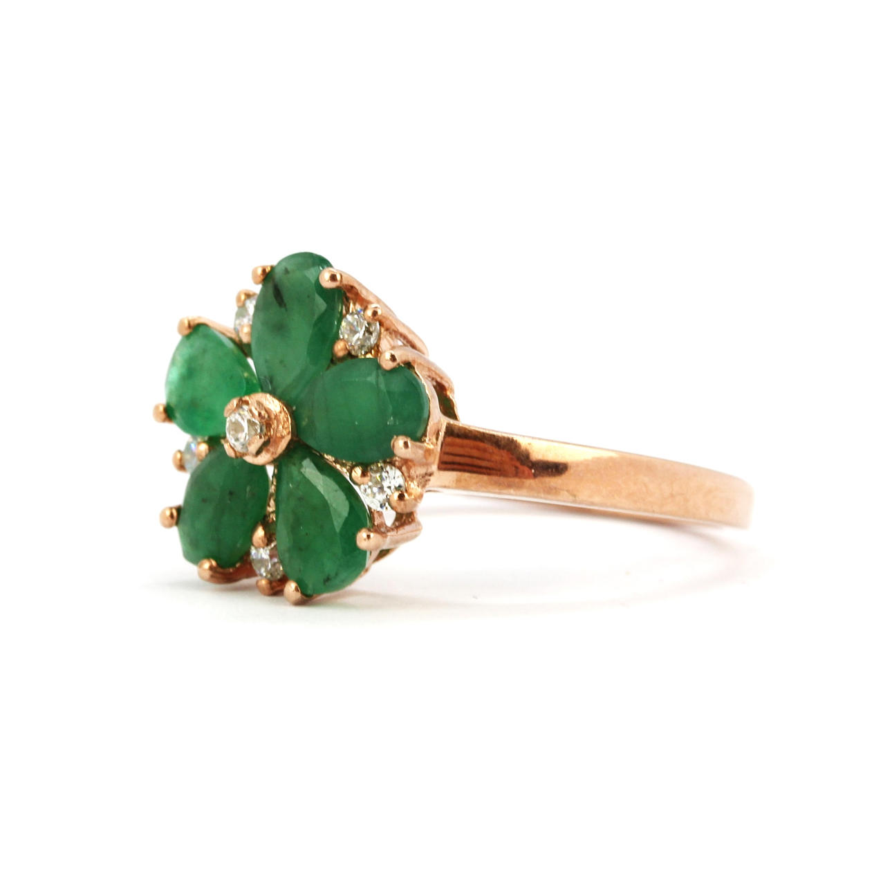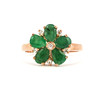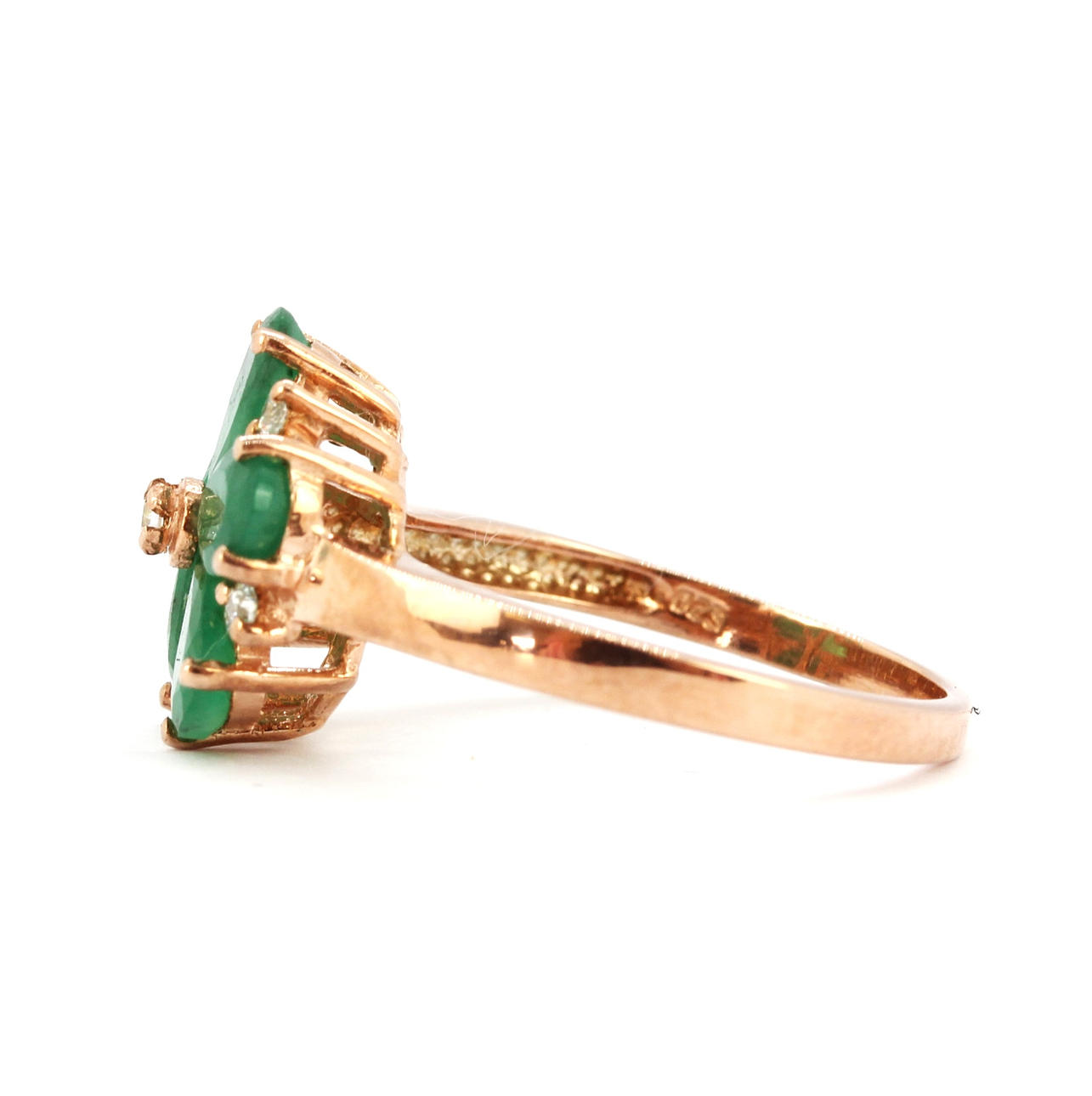 A 925 rose gold on silver flower shaped ring set with pear cut emeralds and white stones, ring size M.5.