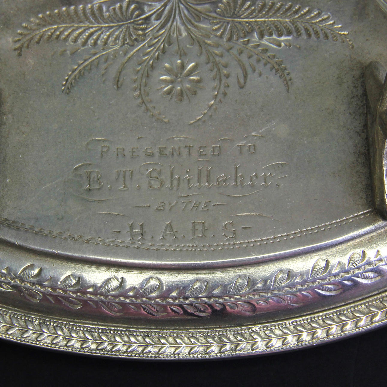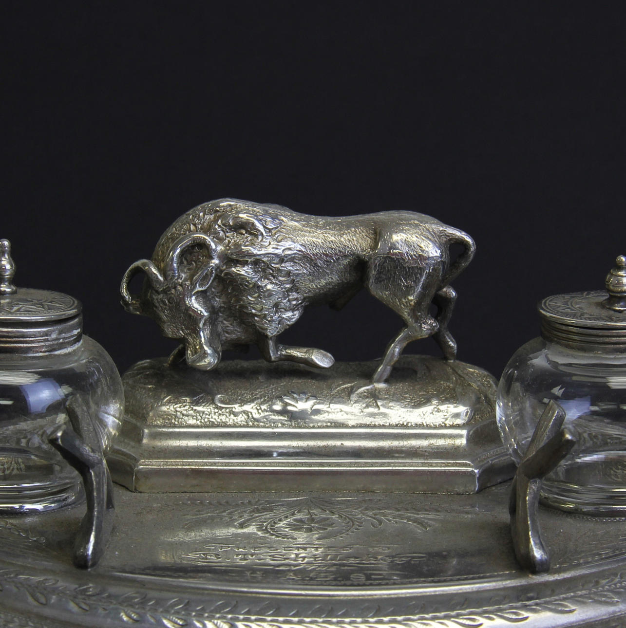 A Victorian James Deakin & Sons desk stand presented to B. T. Shillaker by the H. A.D.S., L. 20.5cm.