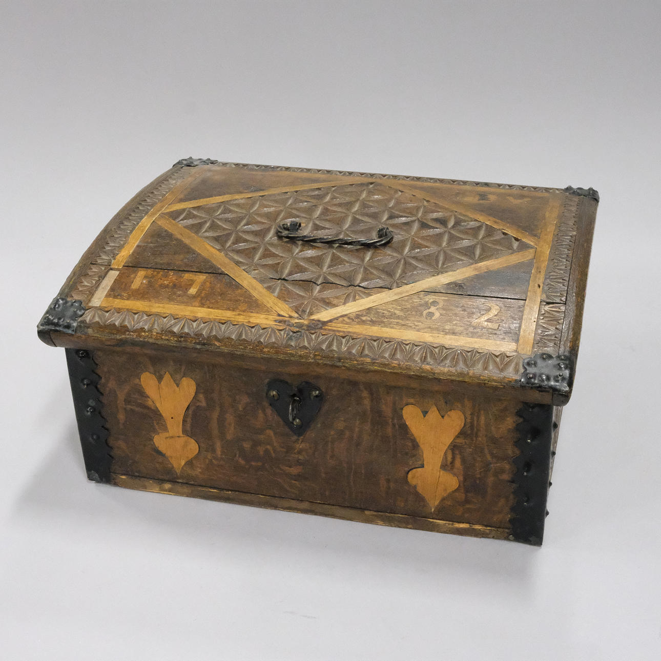 With incisions and carved decoration. Marked 1782. Blackened fittings. Height: approx. 21 cm. Length: approx. 40 cm. Width: approx. 33 cm.