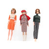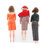 with matching chequered jacket, skirt and hat, red cloak and white boots, with original blonde wig, 27.5cm high, also to include two other miscellaneous dolls, with one wearing a green jumper and jeans, with the other wearing an orange dress, 29cm high each (3).