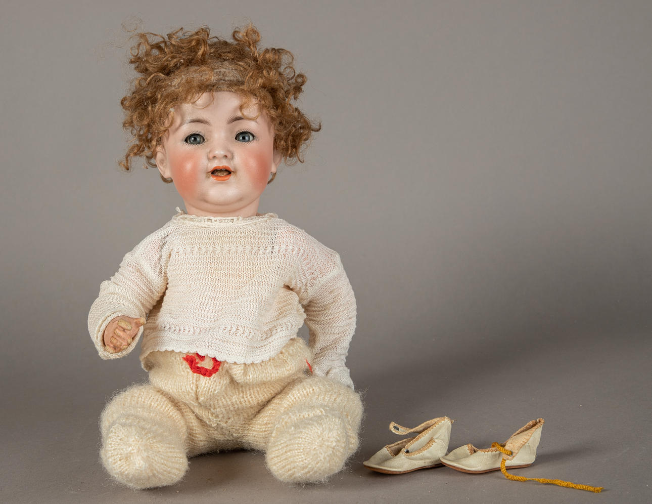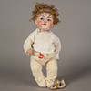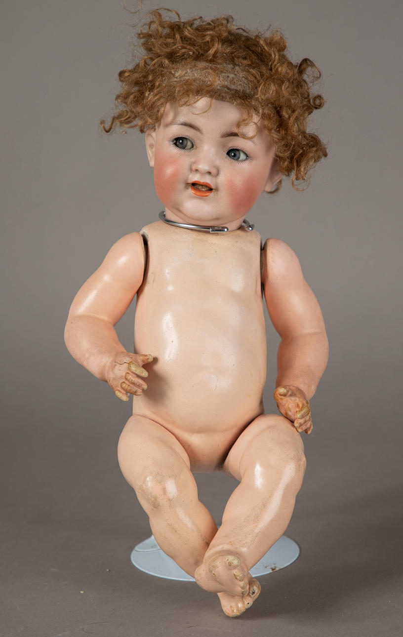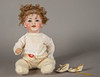 Doll with sitting baby body, Simon & Halbig, marked 126, five-part mass body, socket head made of bisque porcelain, blue impish eyes with painted eyelashes, mouth open with two teeth at the top, dark blond curly real hair wig, size approx.: 40 cm.