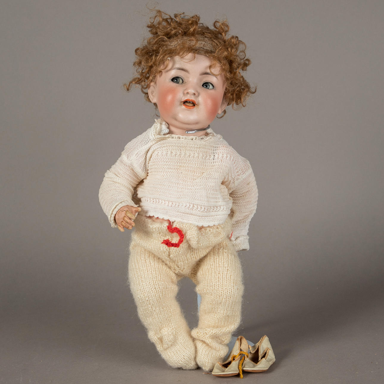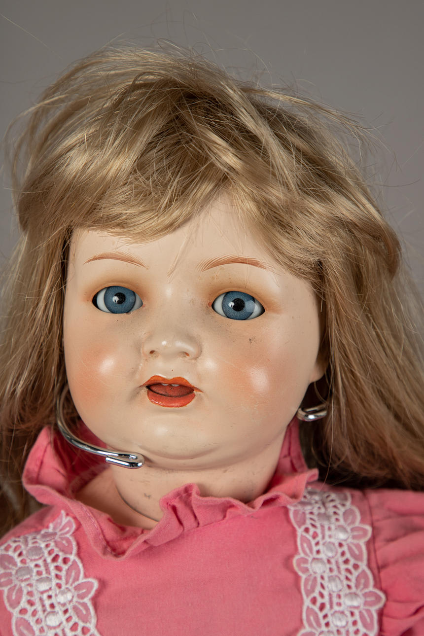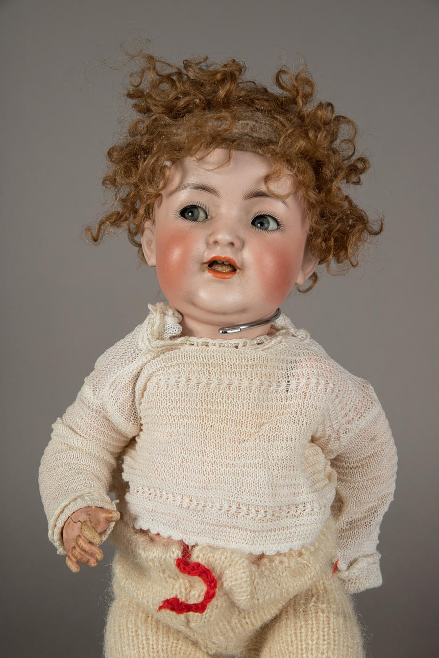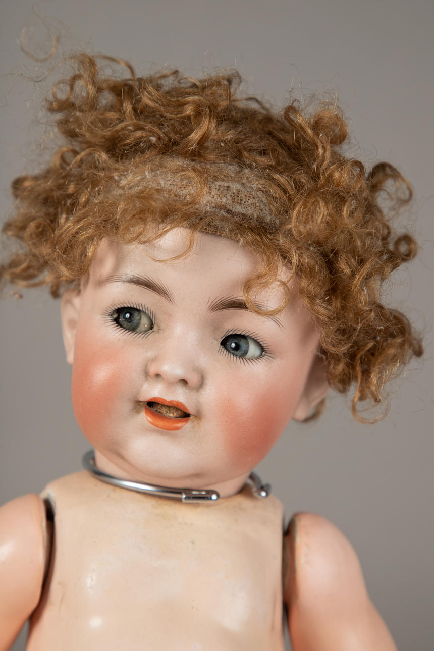 Doll with tuning function, Franz Schmidt & Co., marked 1400/14, five-part mass body with loudspeaker in the stomach, socket head with blue sleepy-impish eyes, open mouth with two little teeth at the top, blond real hair wig, size approx.: 52 cm.