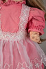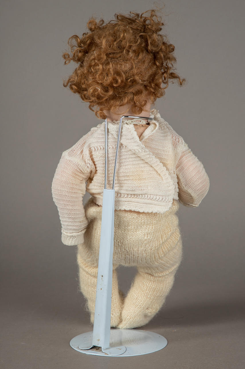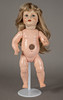 Seated baby body abrasions, bumps and partial cracks, bumped fingers and toes, porous tongue, tangled wig. recorded.