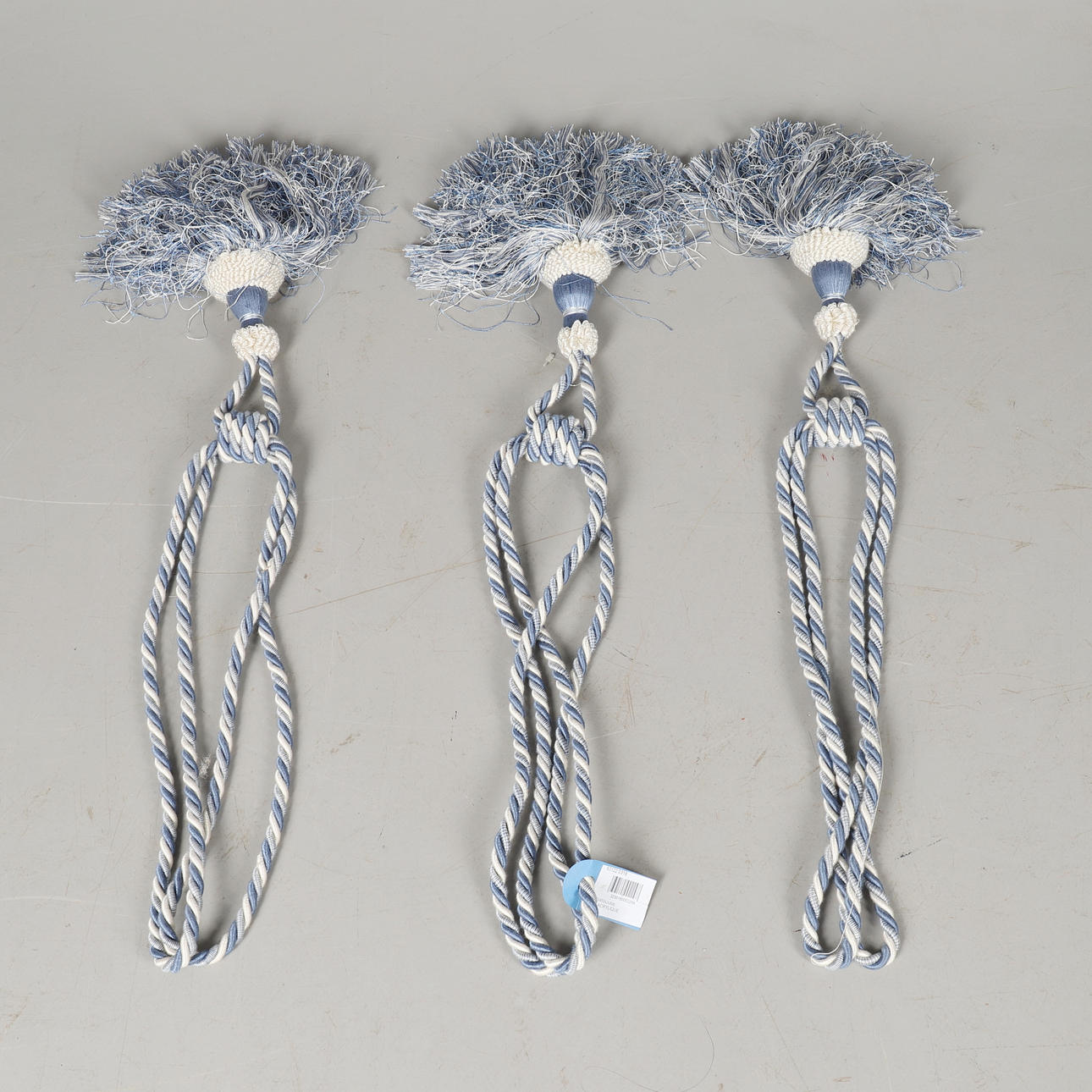 2539634. THREE BLUE CURTAIN TIEBACKS WITH TASSELS.