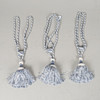 THREE BLUE CURTAIN TIEBACKS WITH TASSELS.