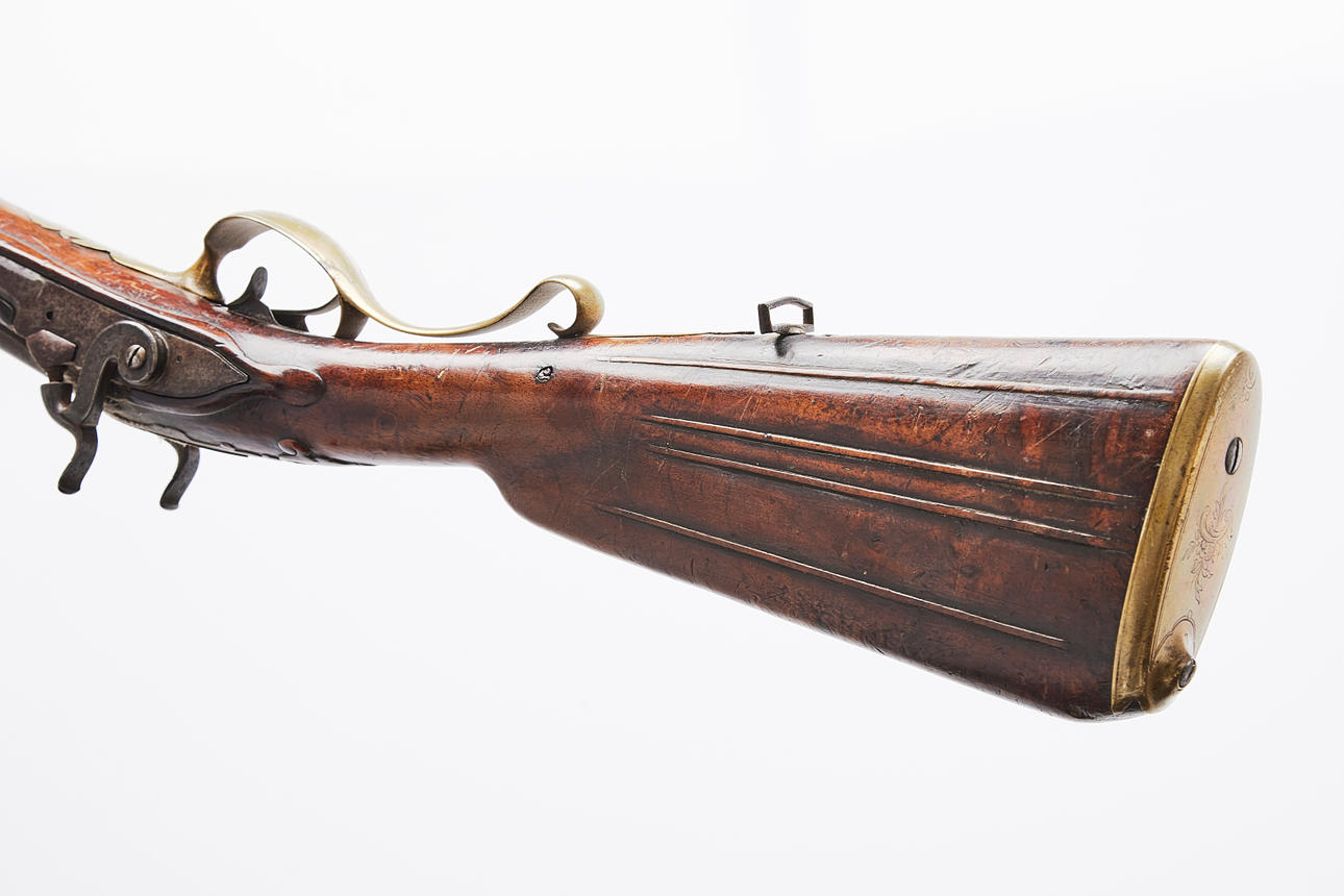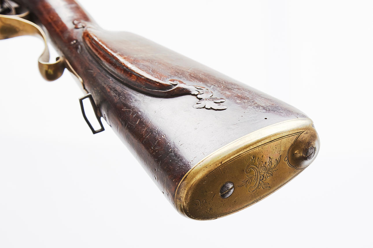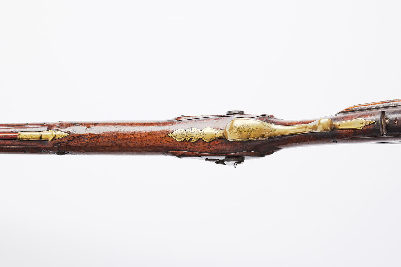 Unclear markings on the lock plate, masking barrels, cut half-stock with engraved brass fittings, length approx. 130 cm Provenance: Gun collector Jan Ståhl, Malmö.