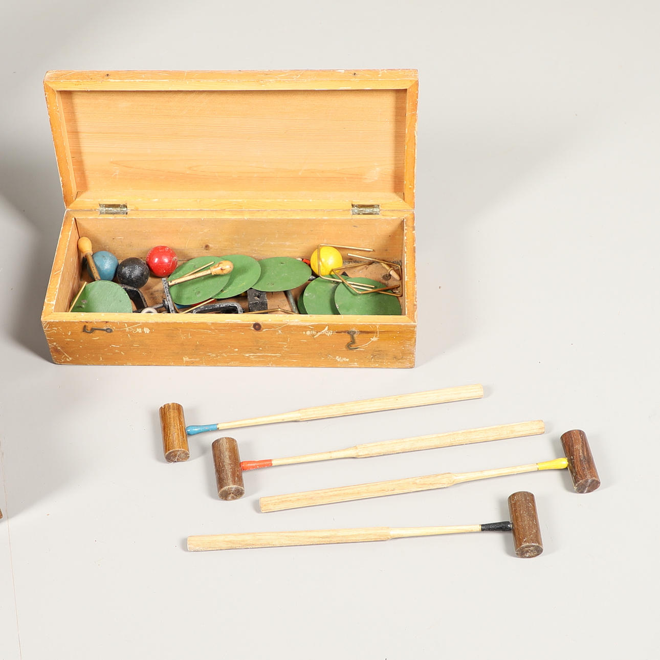 general wear and tear, scratches and marks throughout, chest missing a handle, croquet set incomplete.