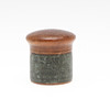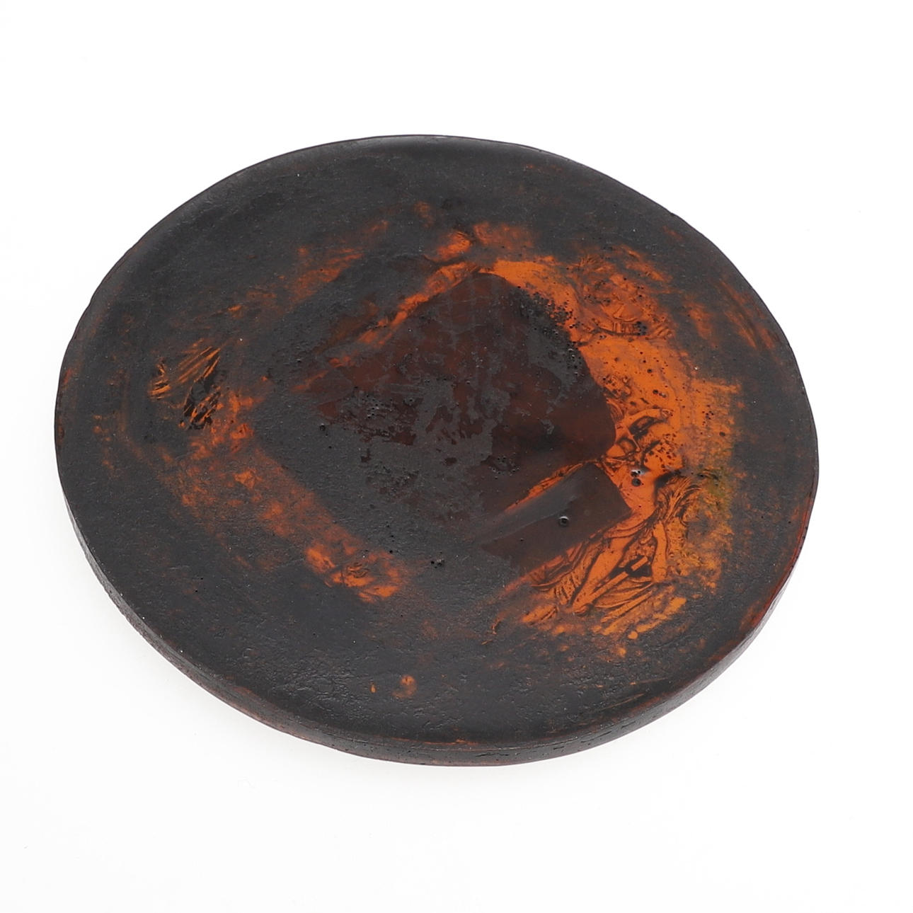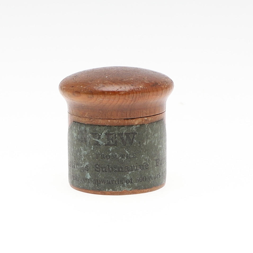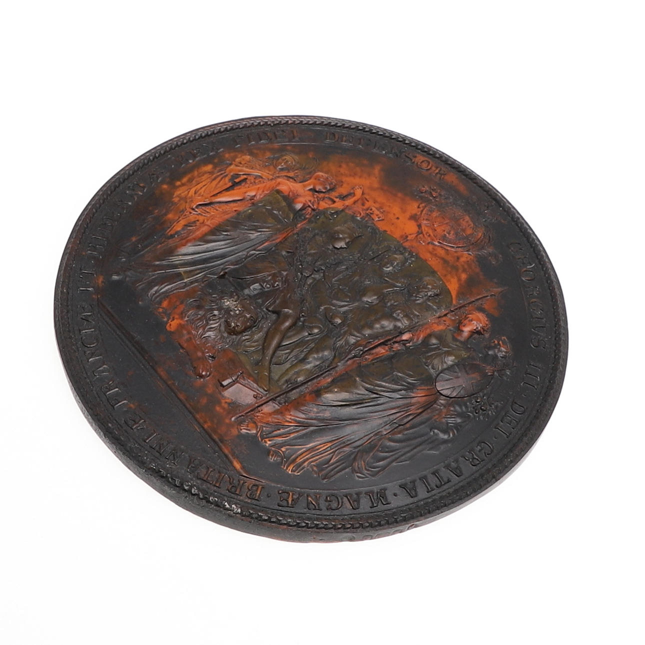 A grant of arms seal in red wax in a gilt metal lidded box with crown to the lid, on a blue ribbon. A cast resin copy of a George III seal or medal, 14cm wide. A small silver counter box hallmarked for Birmingham 1800, 2cm and a similar wooden box. (4).