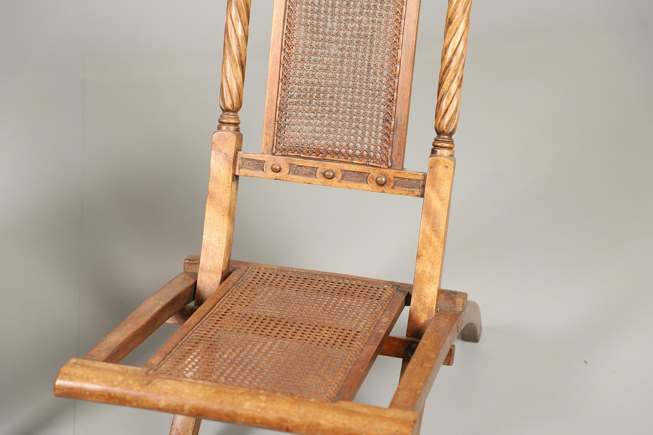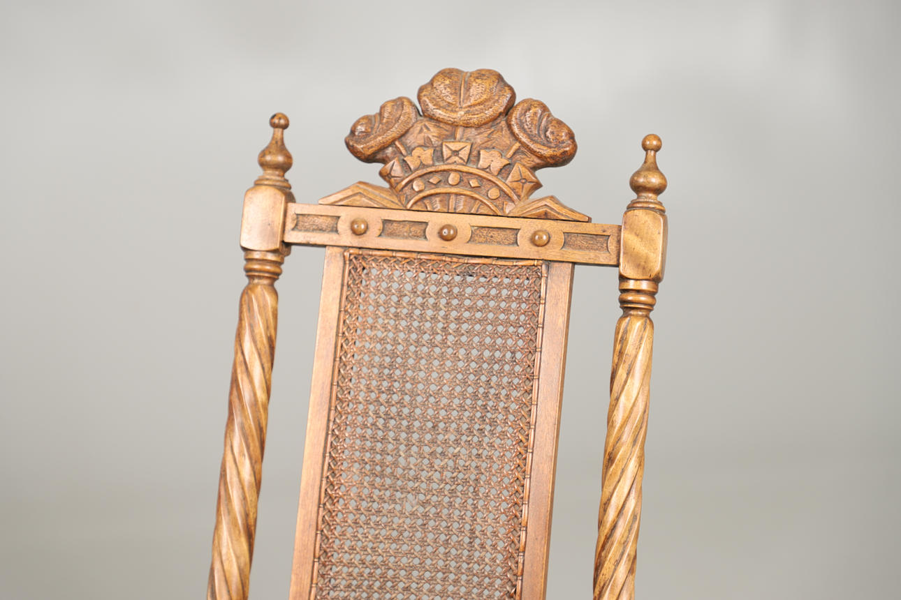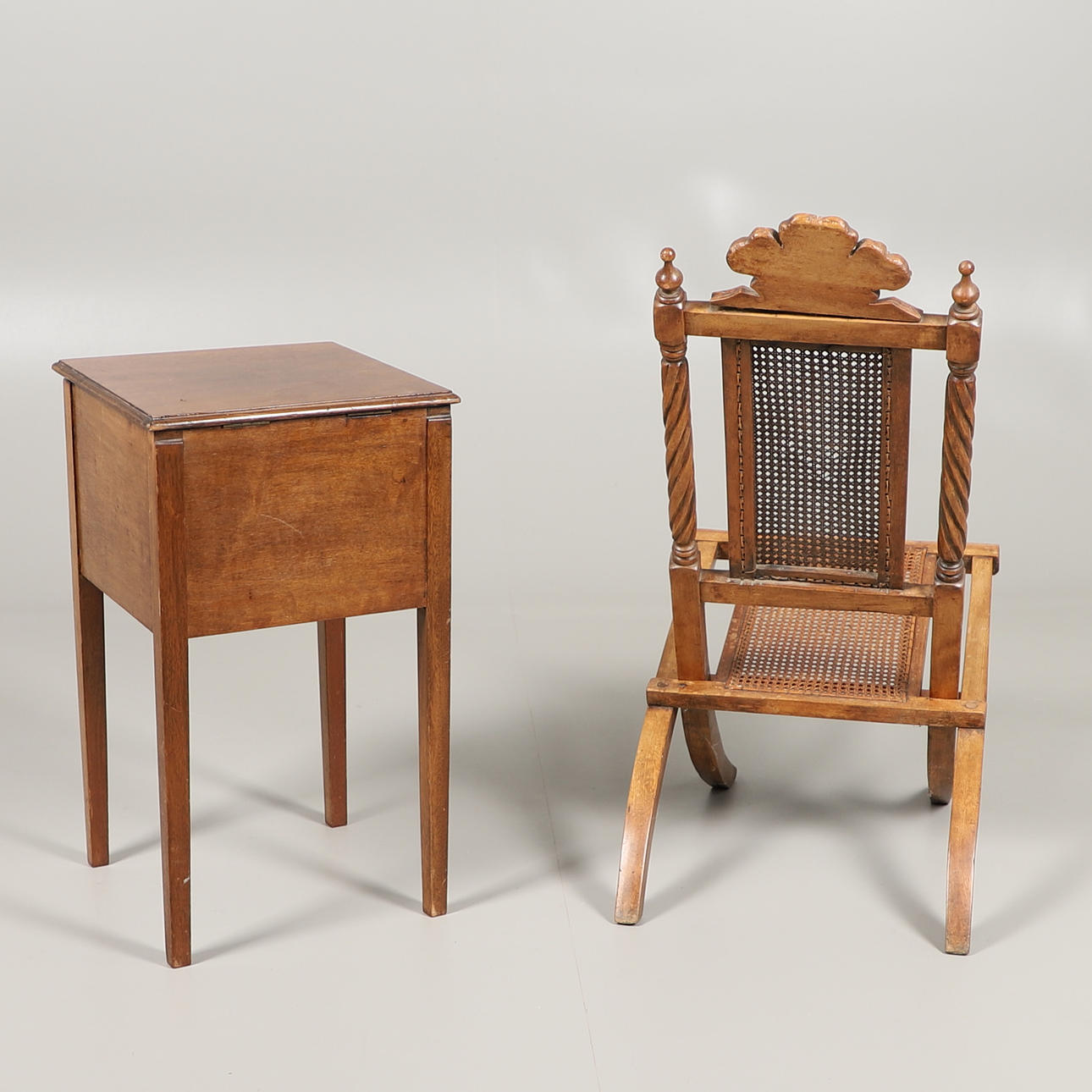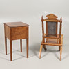 cane seat and back with Prince of Wales feathers to crest rail, 82cm high x 41cm wide, together with an early 20th century mahogany sewing table, some contents including threads, 62cm high x 35cm square.