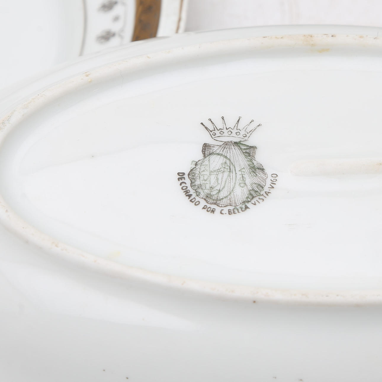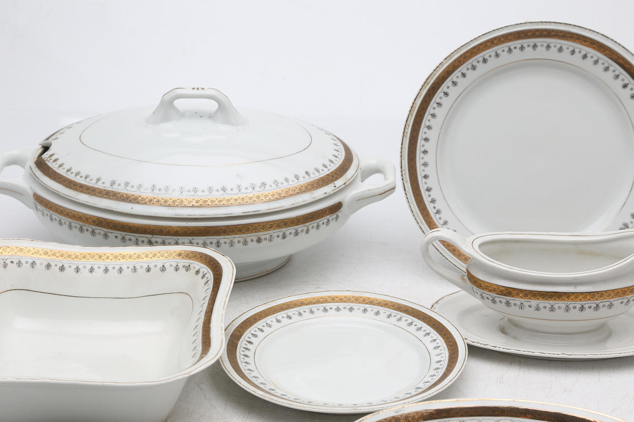 It comprises a tureen, a sauce boat, 24 flat dishes, 12 soup dishes, 12 dessert dishes, 3 oval trays, a round tray and a salad bowl. Total 67 items.
