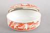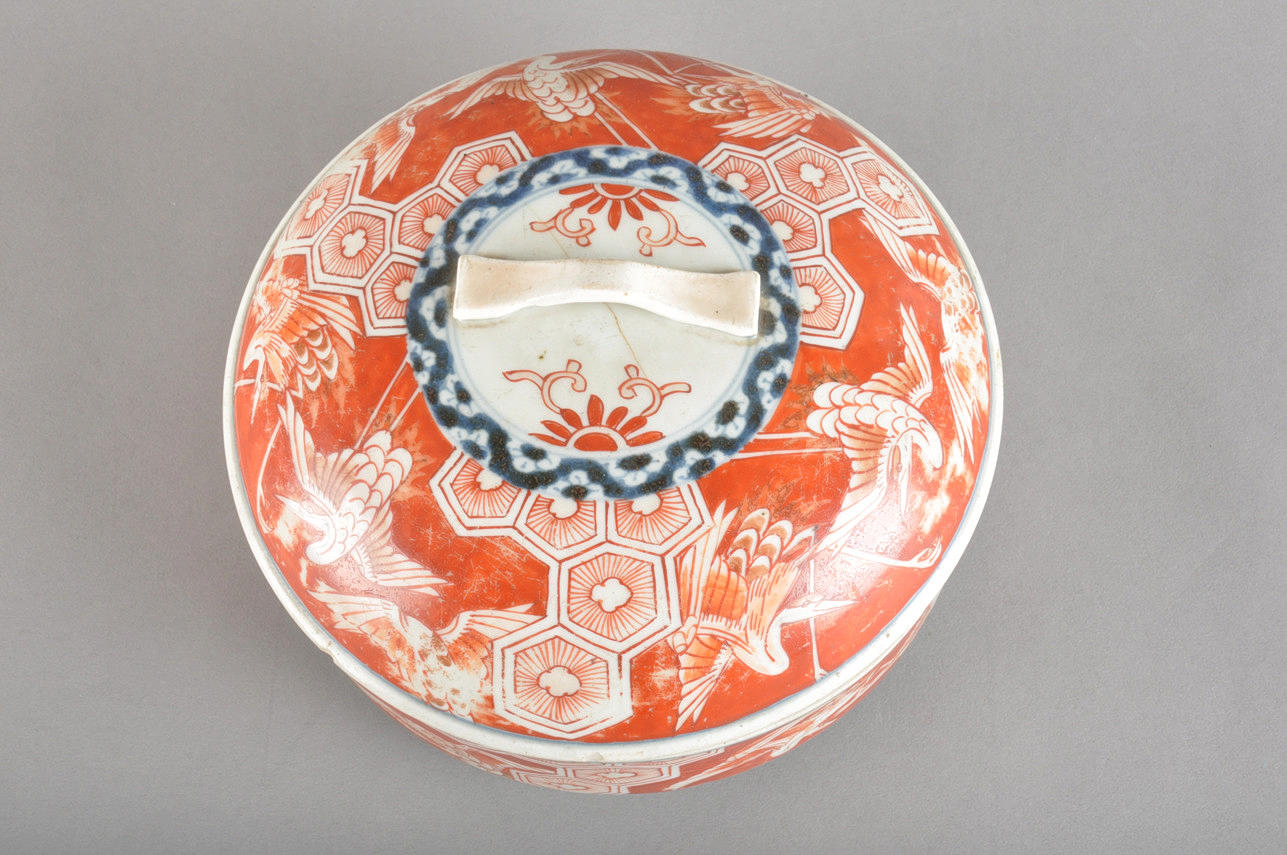 Painting underglaze blue and red onglaze. Motif honeycomb pattern and heron, surrounded by blue rings. dimensions approx. 17x6cm.