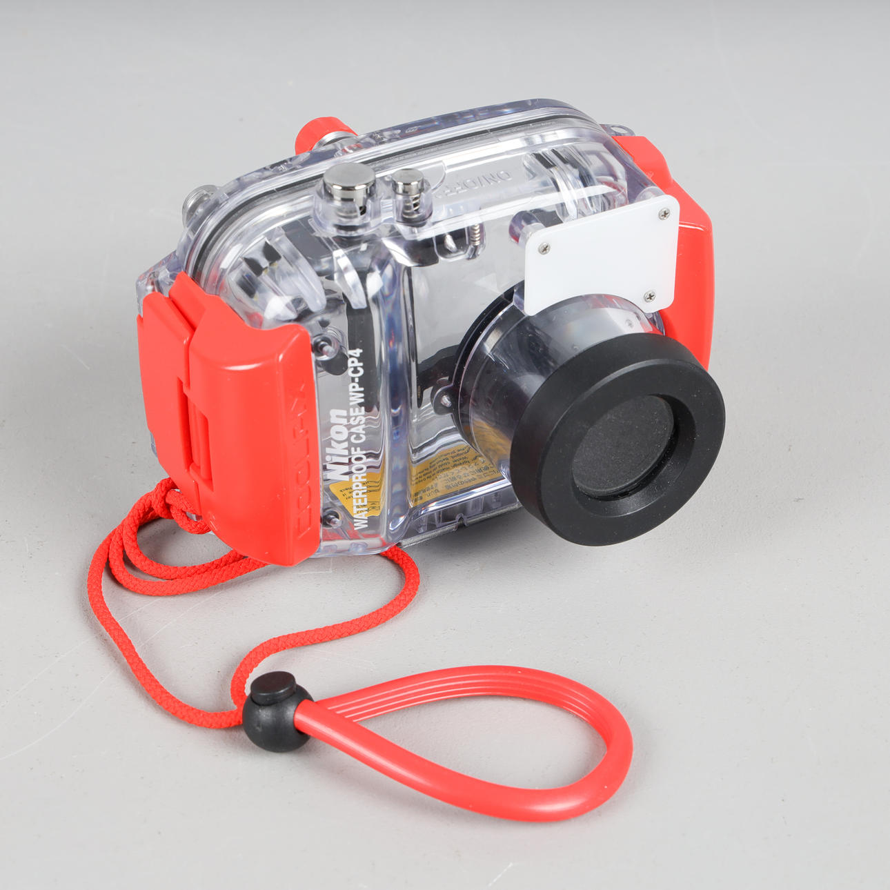 Waterproof shell for Nikon camera. Nikon WP-CP4 Waterproof case. Transparent plastic with orange details.