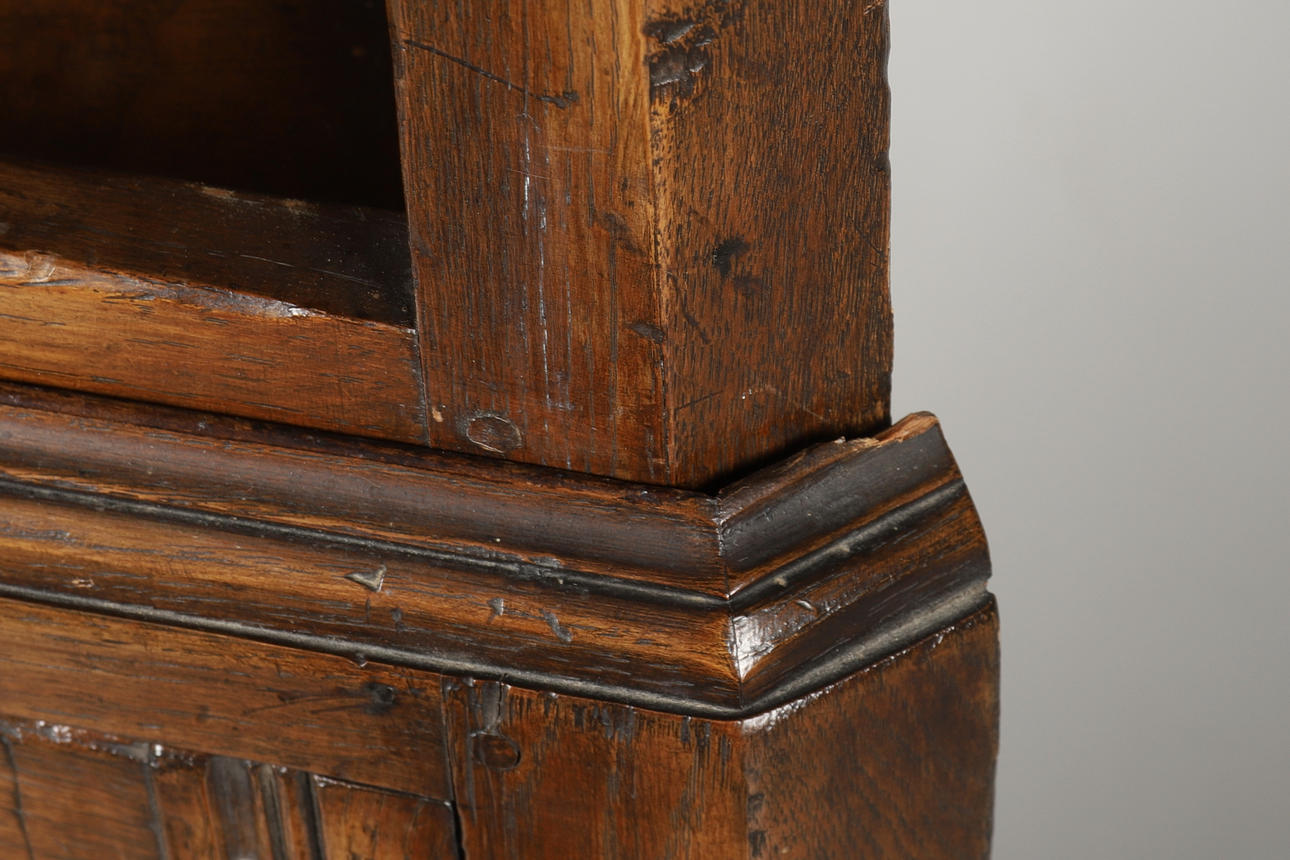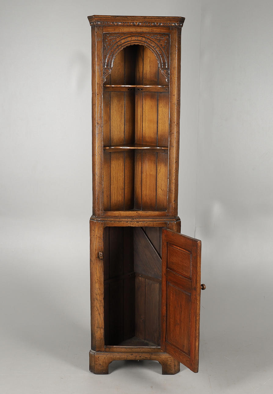 2560328. A REPRODUCTION CARVED OAK TWO PART CORNER CUPBOARD.