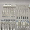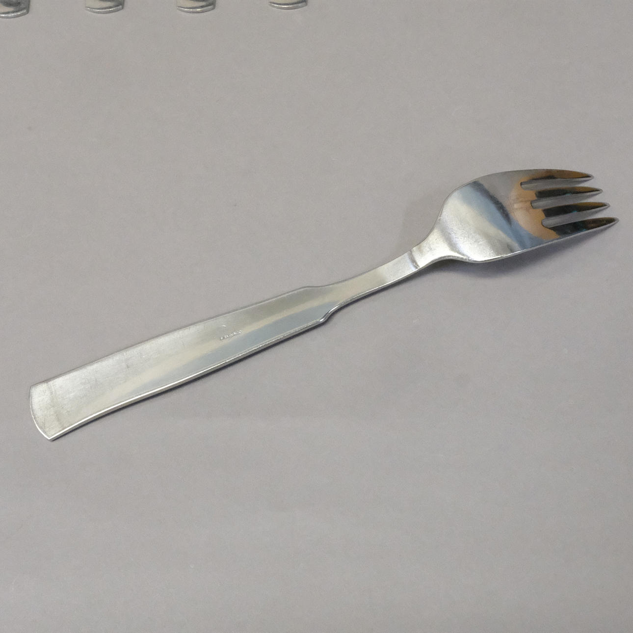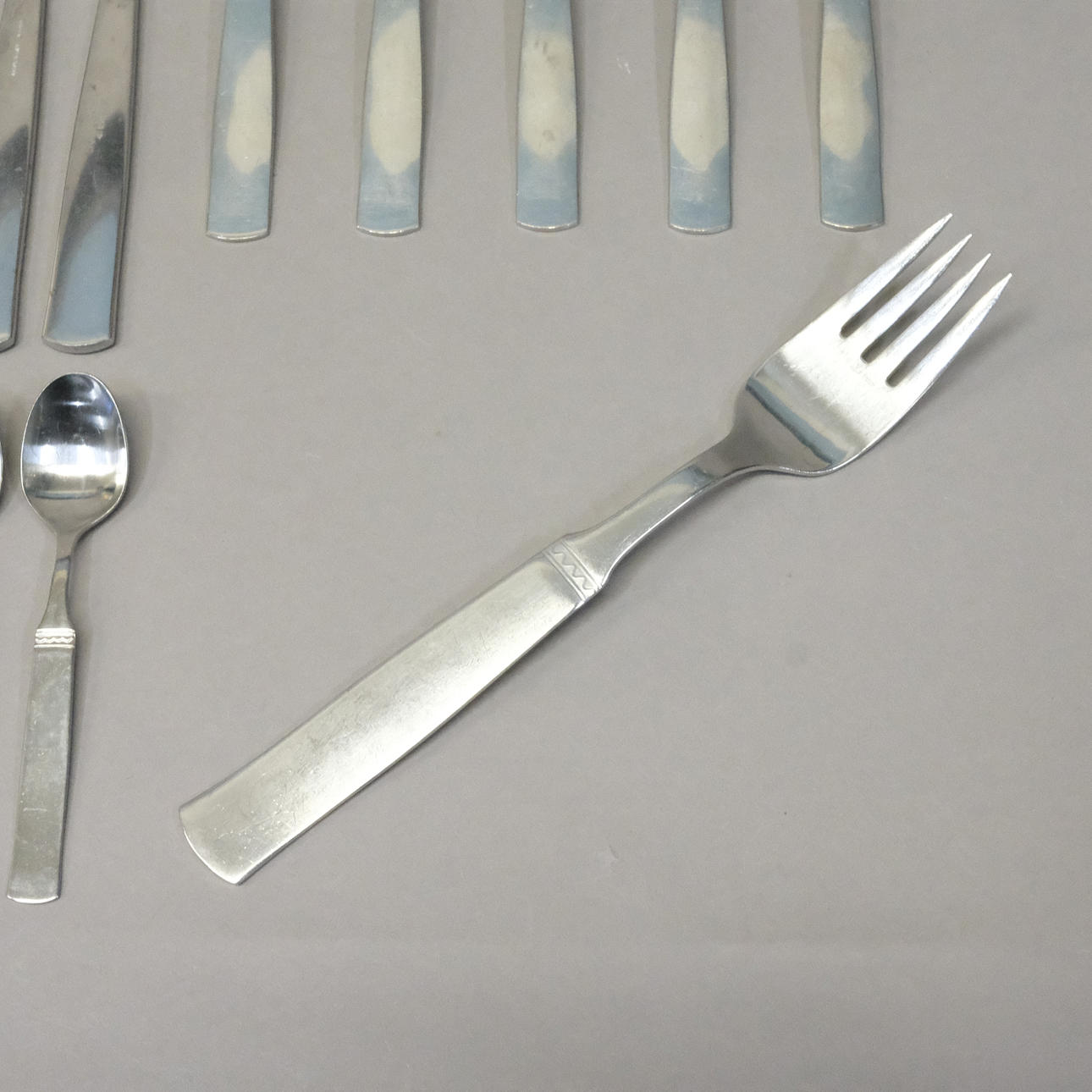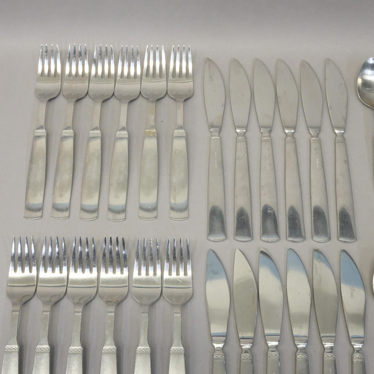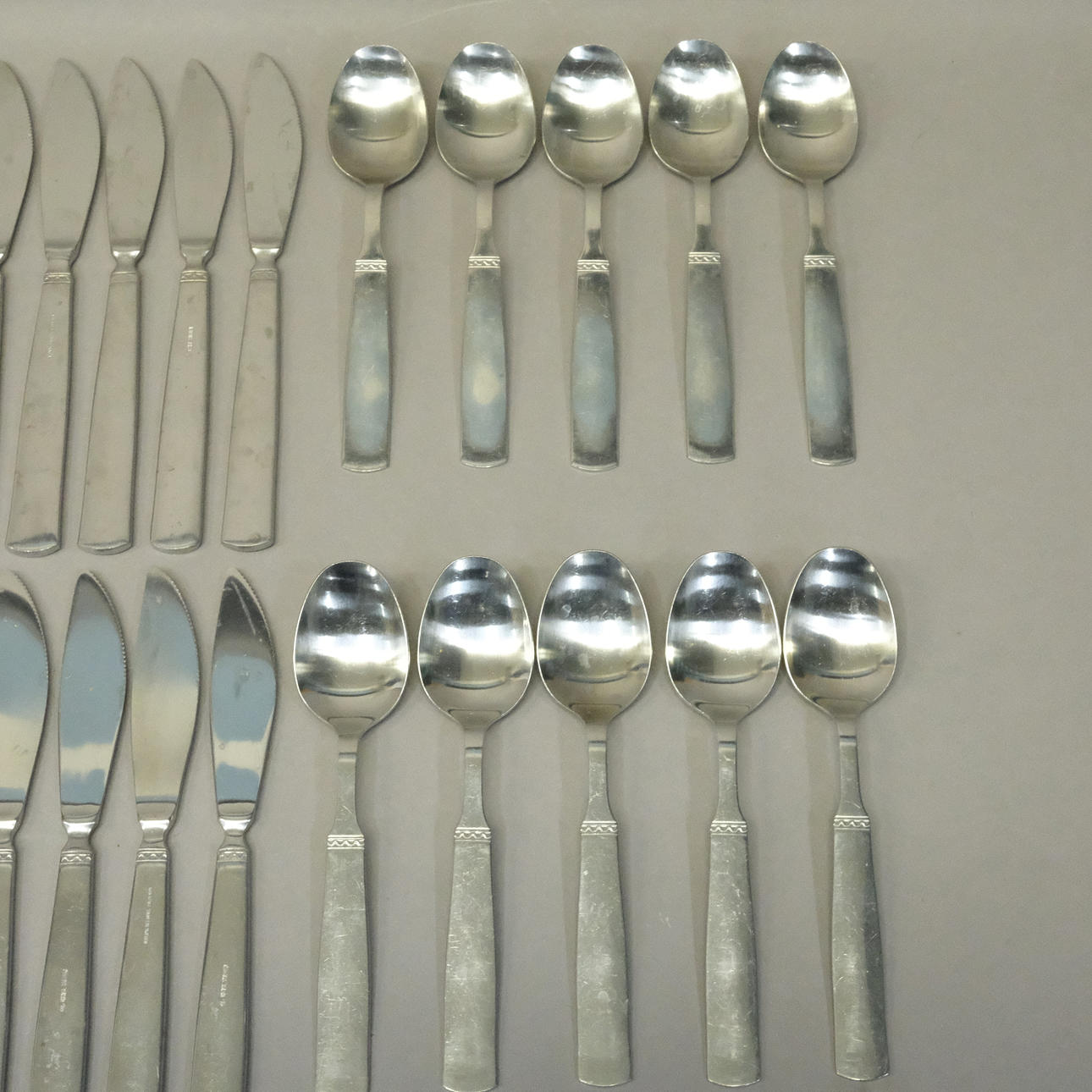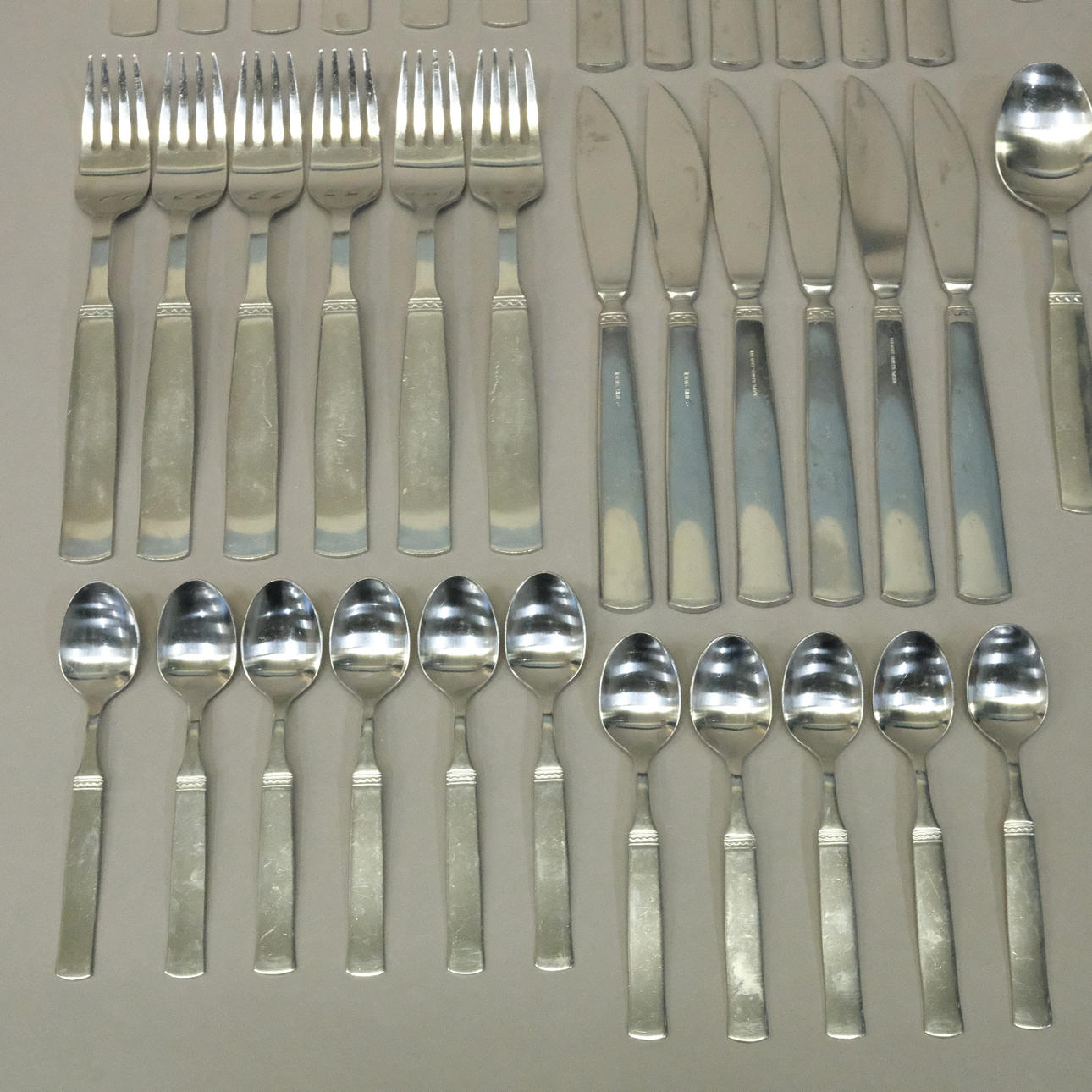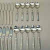 12 forks, length 18.5cm, 12 knives, length 20cm, 10 spoons, length 16.5cm, 11 spoons, length 12cm and serving fork, length 22.5cm.