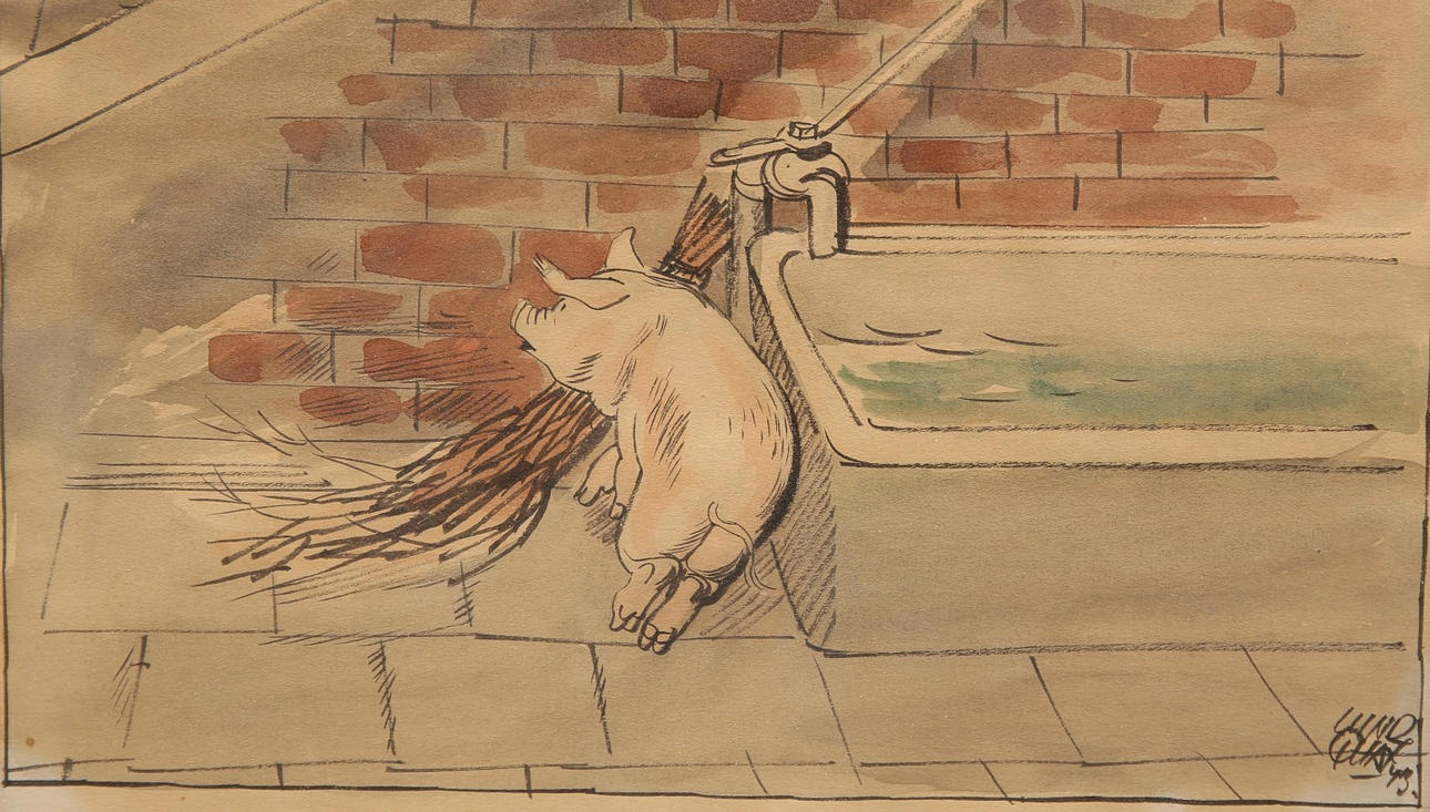 BIRGER LUNDQUIST. Watercolor, Christmas pig, signed Lindquist, dated -43.