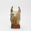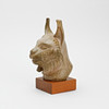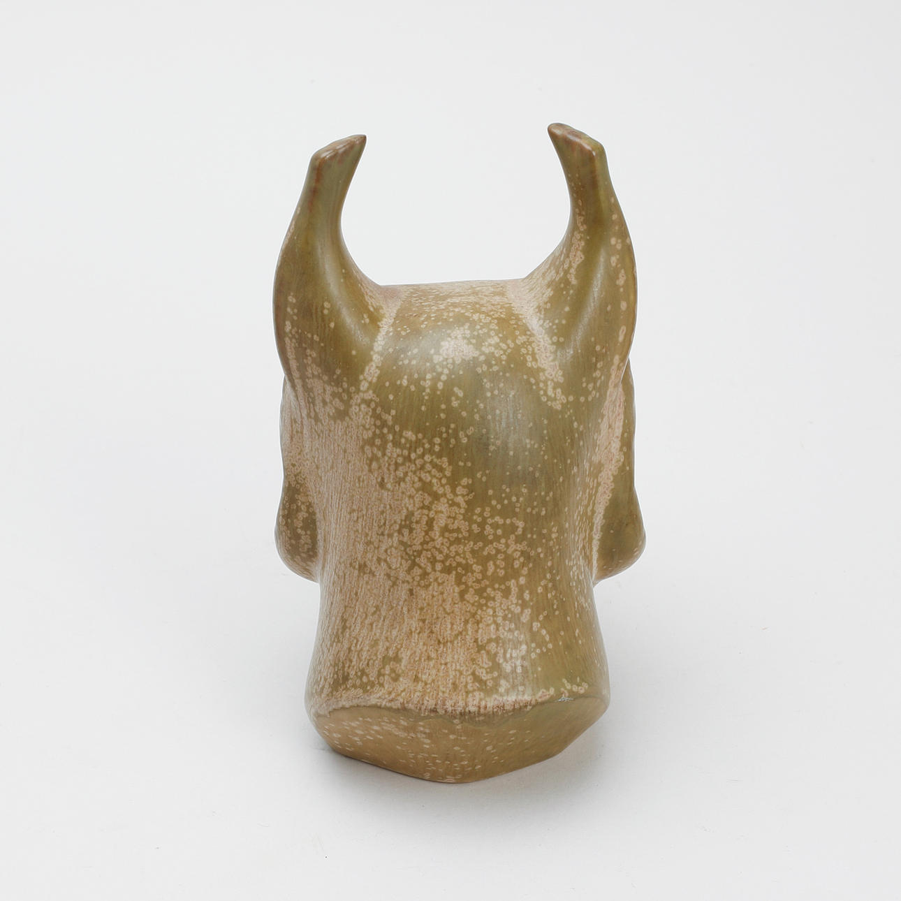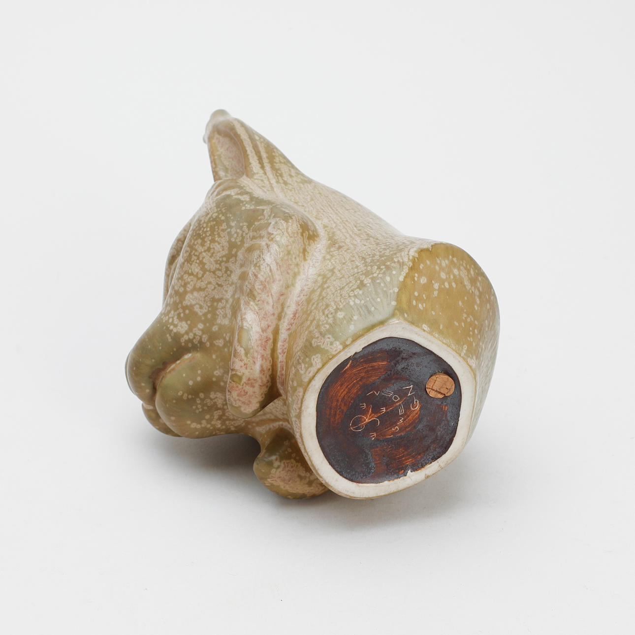 Glazed in green-brown tones. On wooden plinth. Height 24.5 cm including plinth.