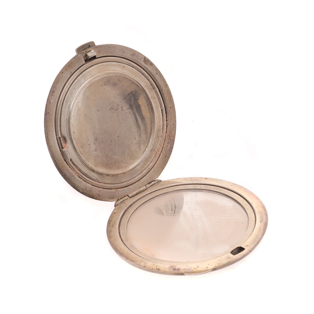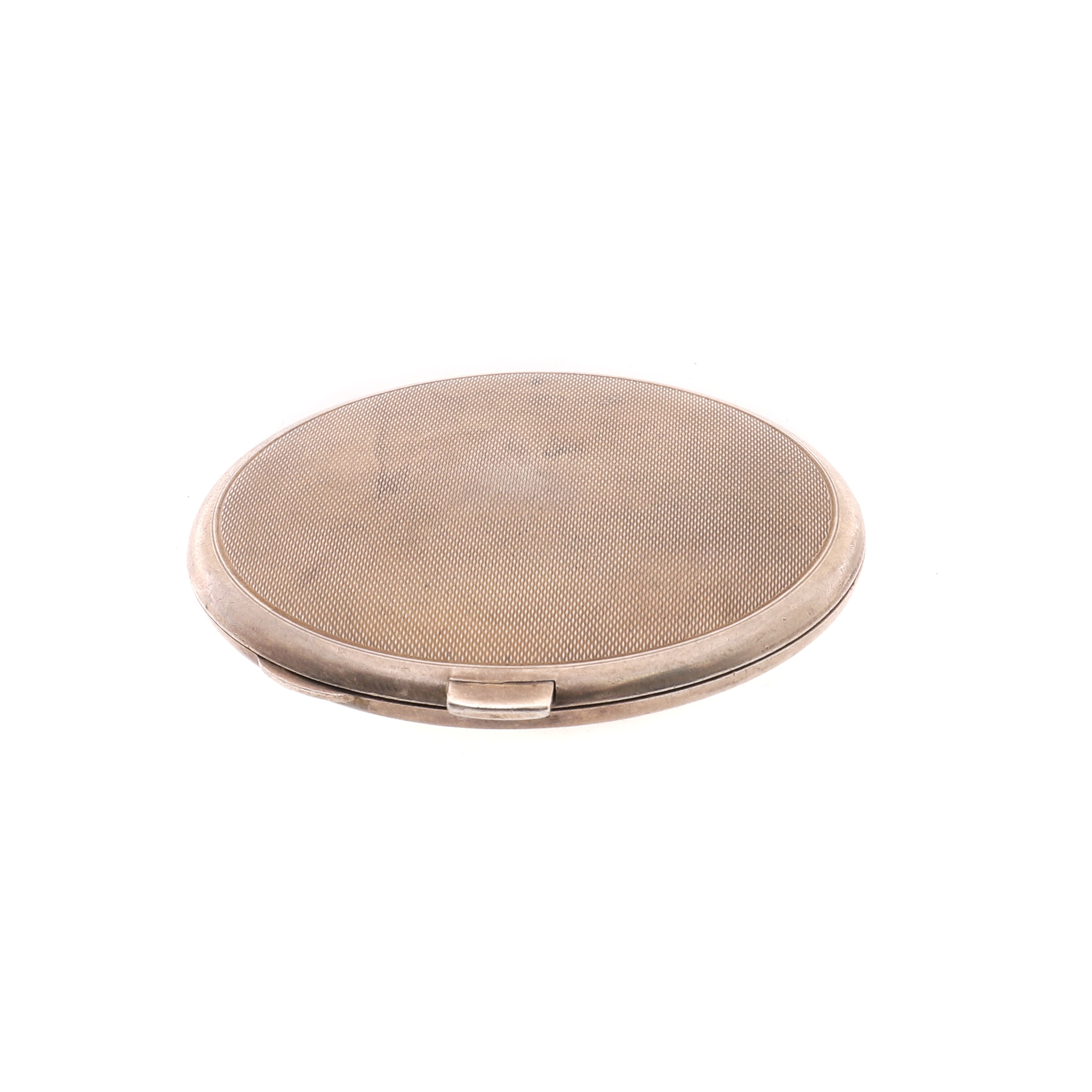 2578356. A SILVER AND GUILLOCHE ENAMEL ENGINE TURNED CIRCULAR COMPACT.
