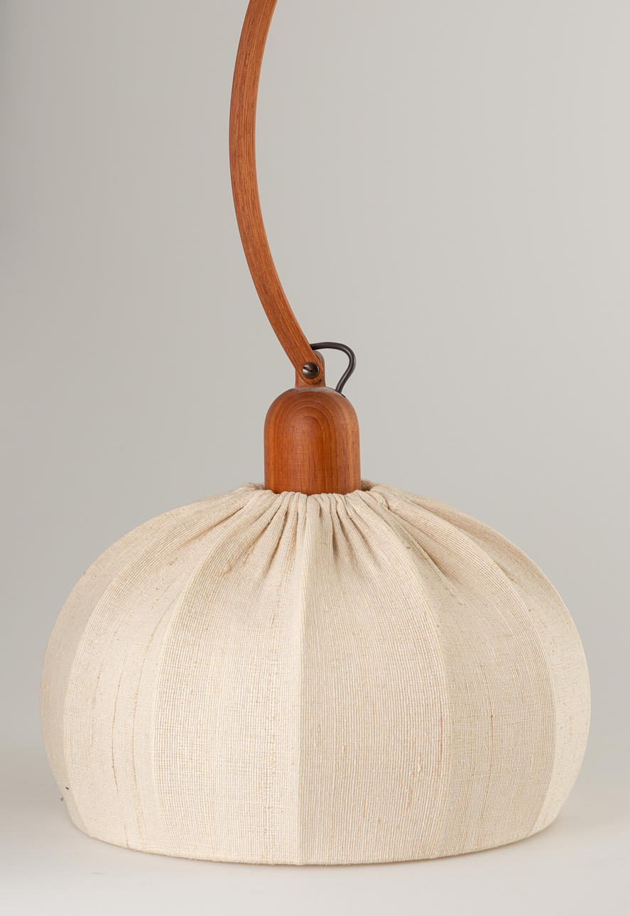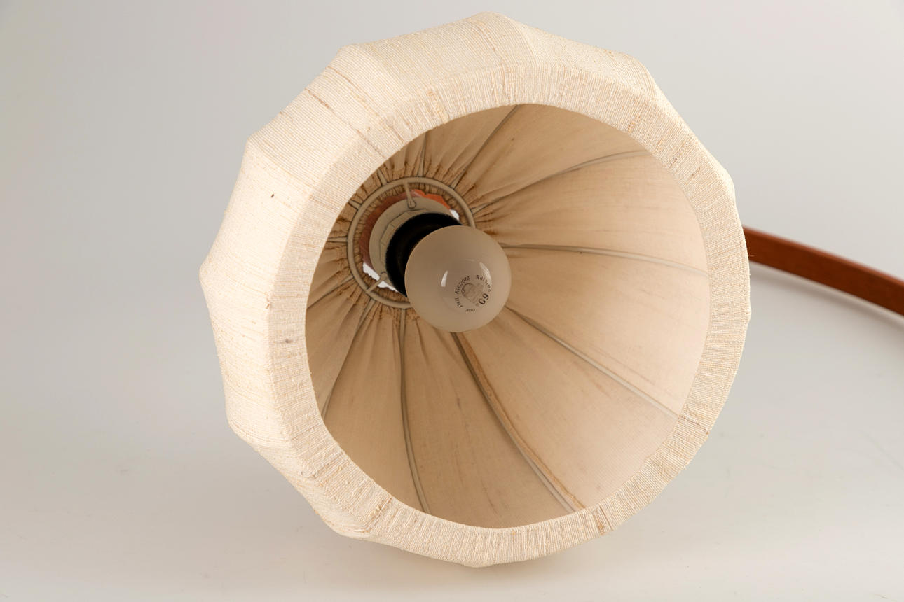 Teak wall lamp. Mid-century design. For attachment to the wall. Infinitely height-adjustable and swiveling lamp head. Lampshade covered with fabric.