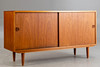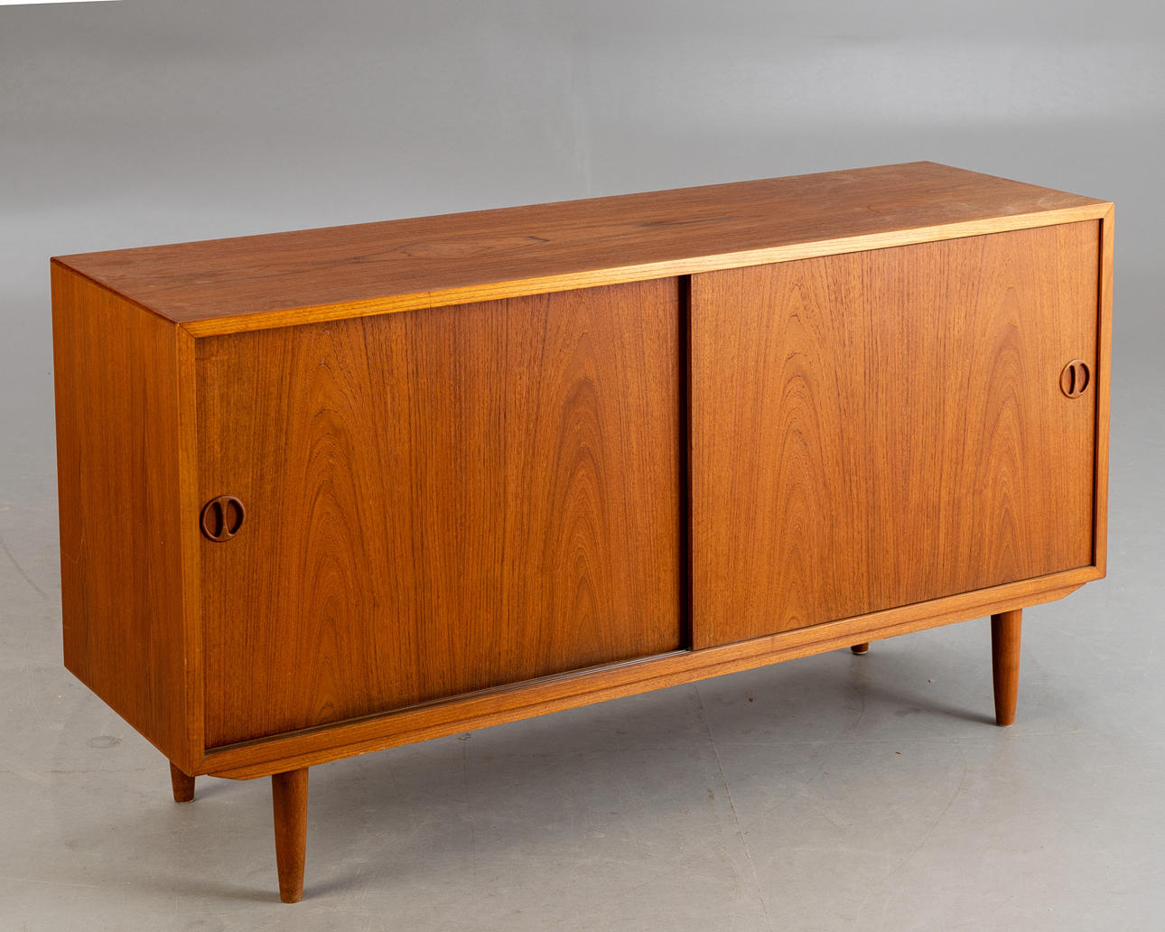 Small teak sideboard. Denmark, 1960s. Chest of drawers with 2 sliding doors. Internal shelves and a drawer. Stamped 'Made in Denmark' on the back.