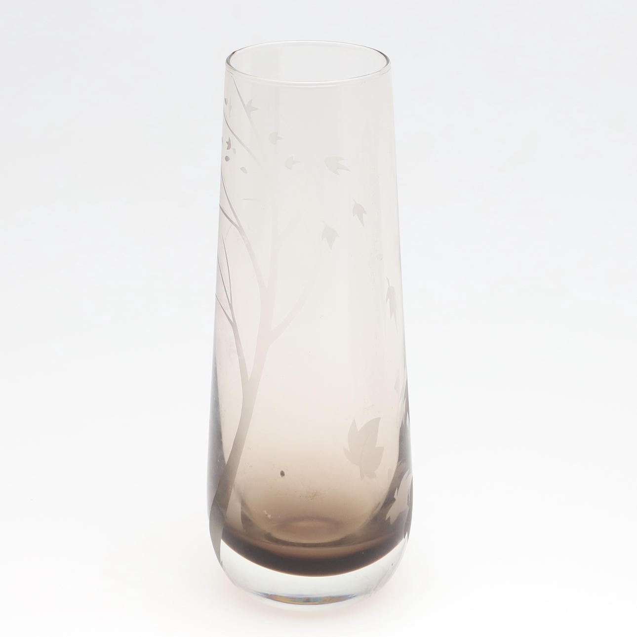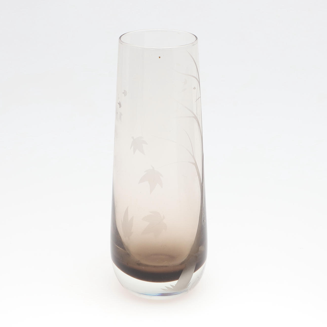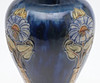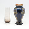 of baluster form, decorated in the Art Nouveau style with slender flowers on a deep blue ground, impressed factory marks, 26.5cm high, together with a smoky glass vase, monogrammed JM, dated 1980, and inscribed 'Autumn Leaves' 23cm high.