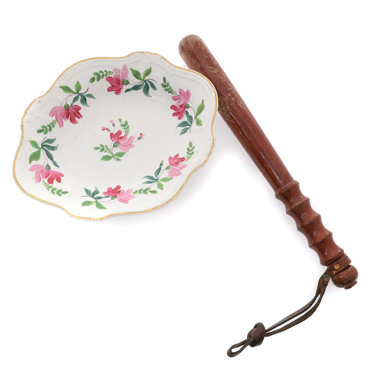 The turned handle with leather hand grip, 39.5cm long and an English porcelain dish, circa 1800, pattern no. 654, of shaped outline, painted with flowers, leaves and a gilt border, 28cm long (2).