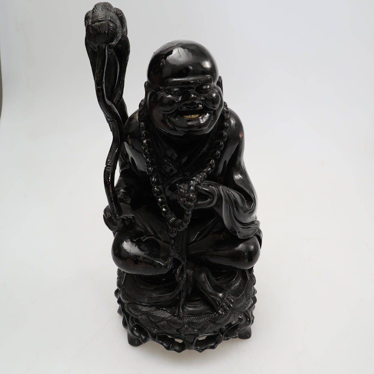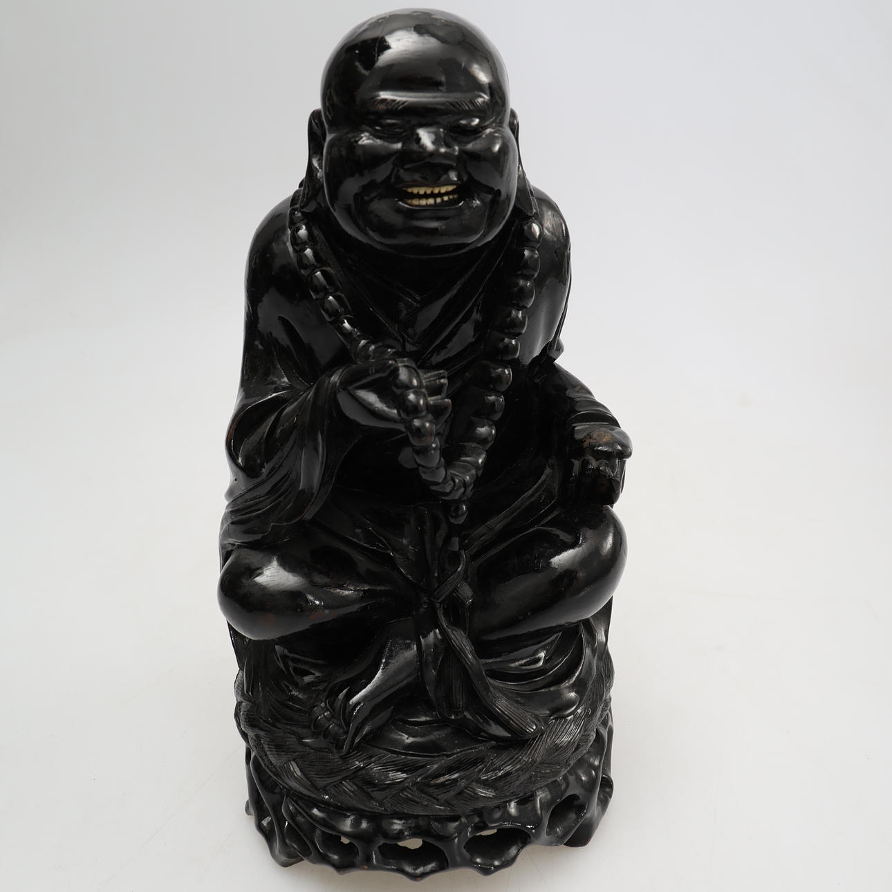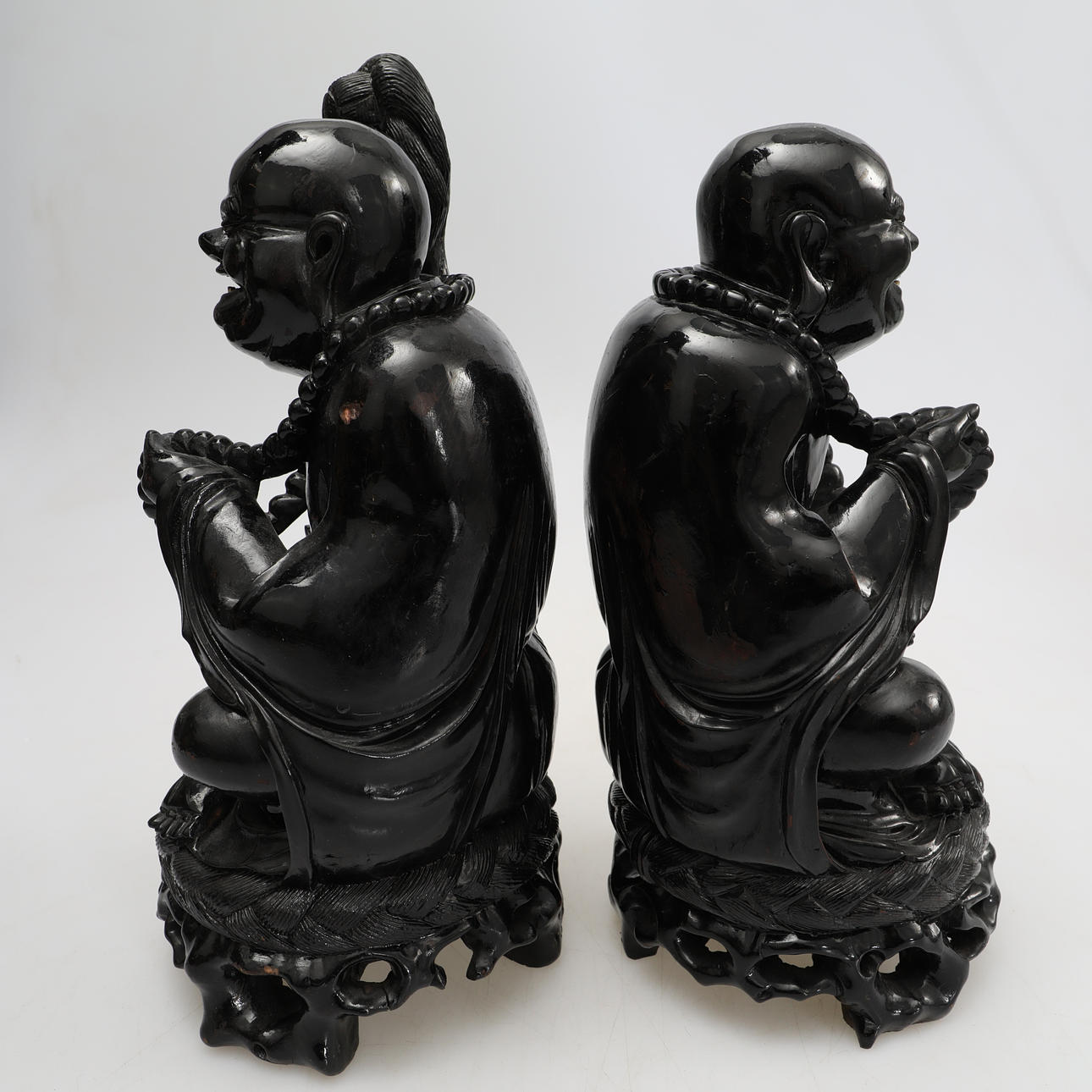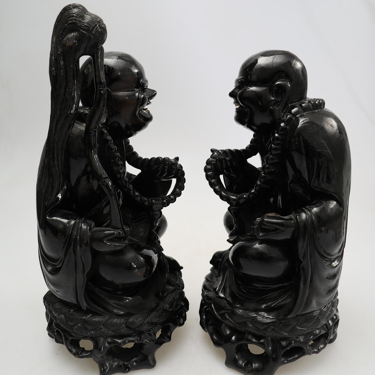 2589164. FIGURES, 2 smiling Buddha figures, wood.