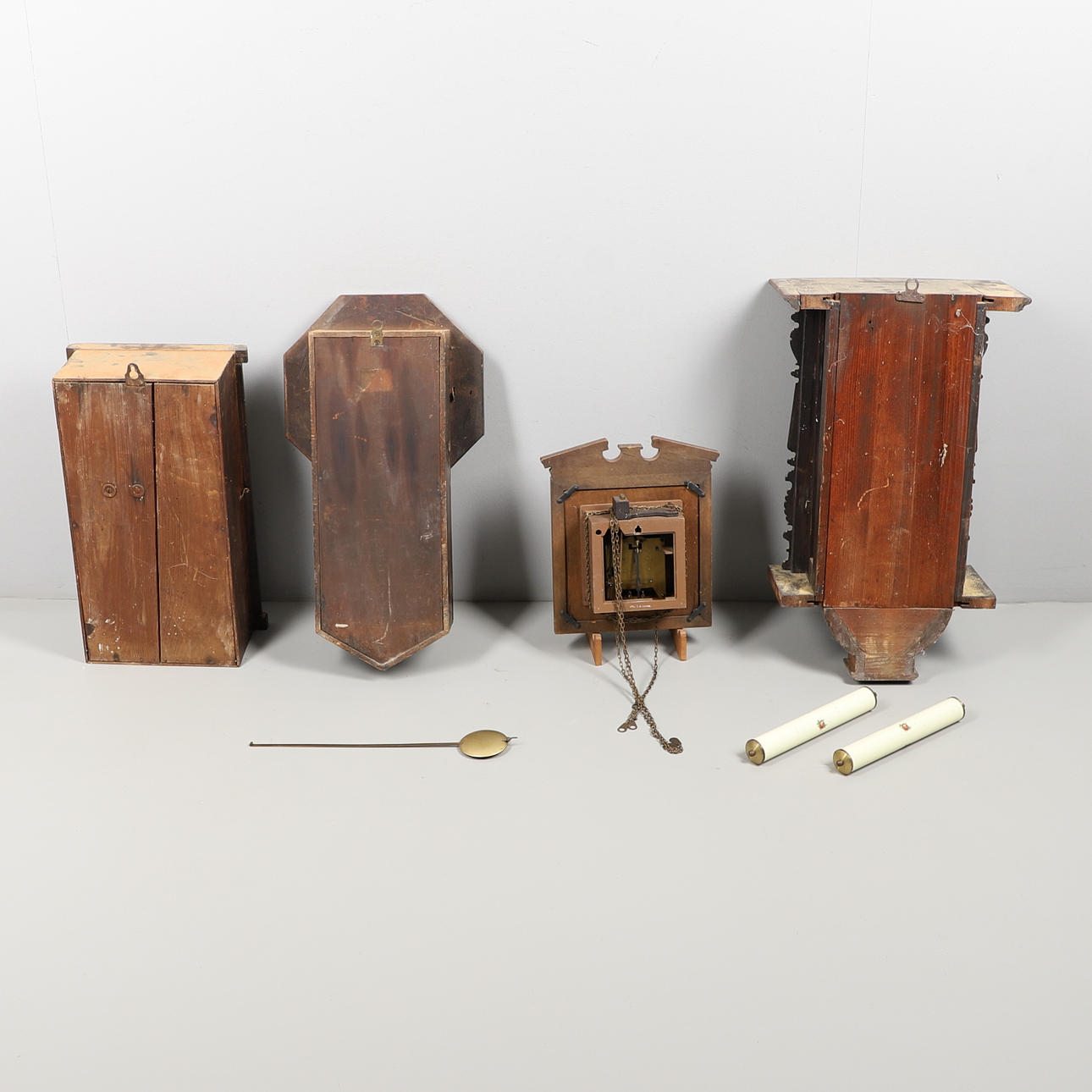 Three of the Clocks have dual train movements, pendulums and keys, apart from the KO Regulator that is missing its key. Along with a Reproduction later 20th century wall clock with pendulum and weights. (4).