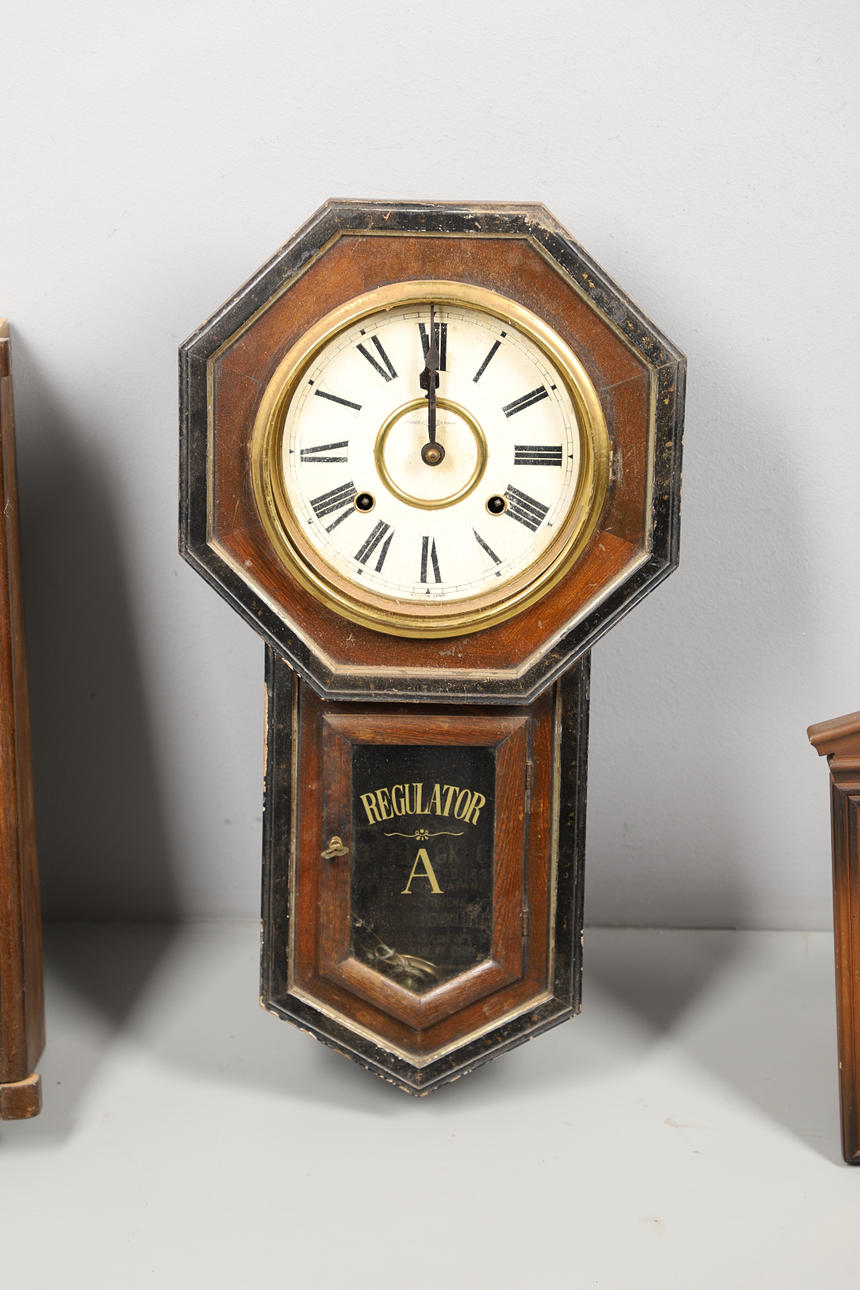 All sold in untested condition, for spares/repairs and could all do with restoration, except the Reproduction wall clock which was in working condition when the client brought it for sale. The face glass on the regulator clock is missing.