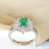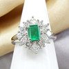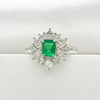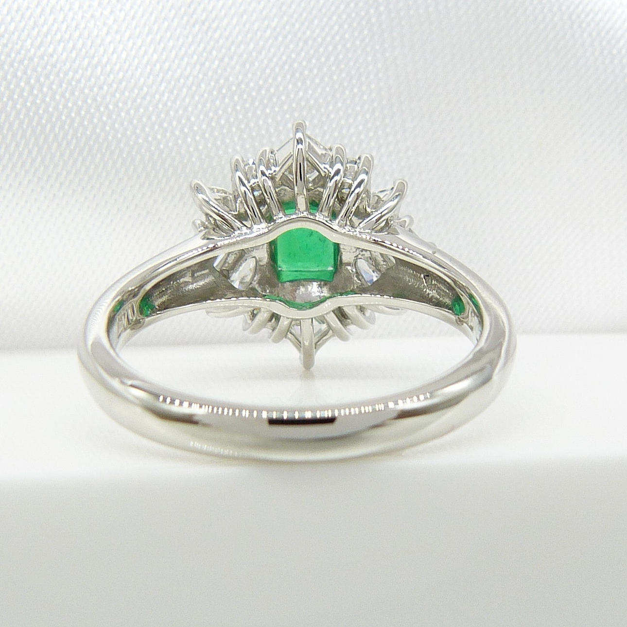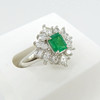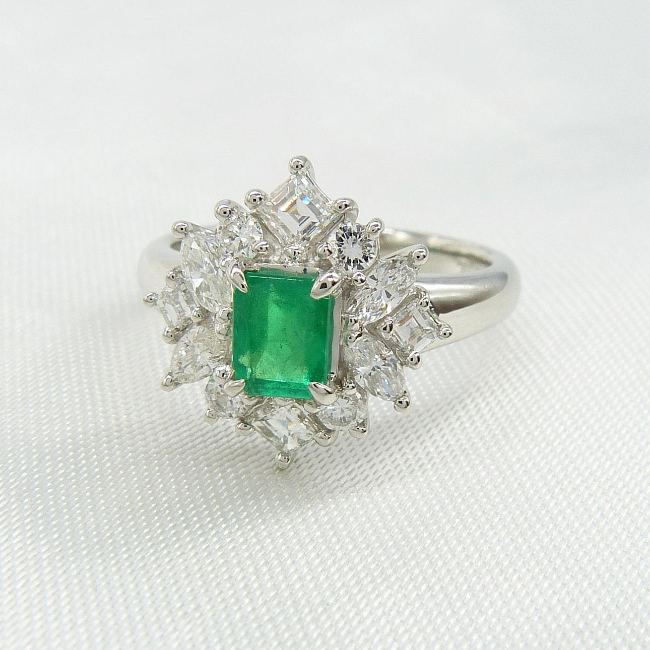 A fine quality, platinum cluster ring set with a central emerald with surrounding round brilliant, marquise, and Asscher-cut diamonds.