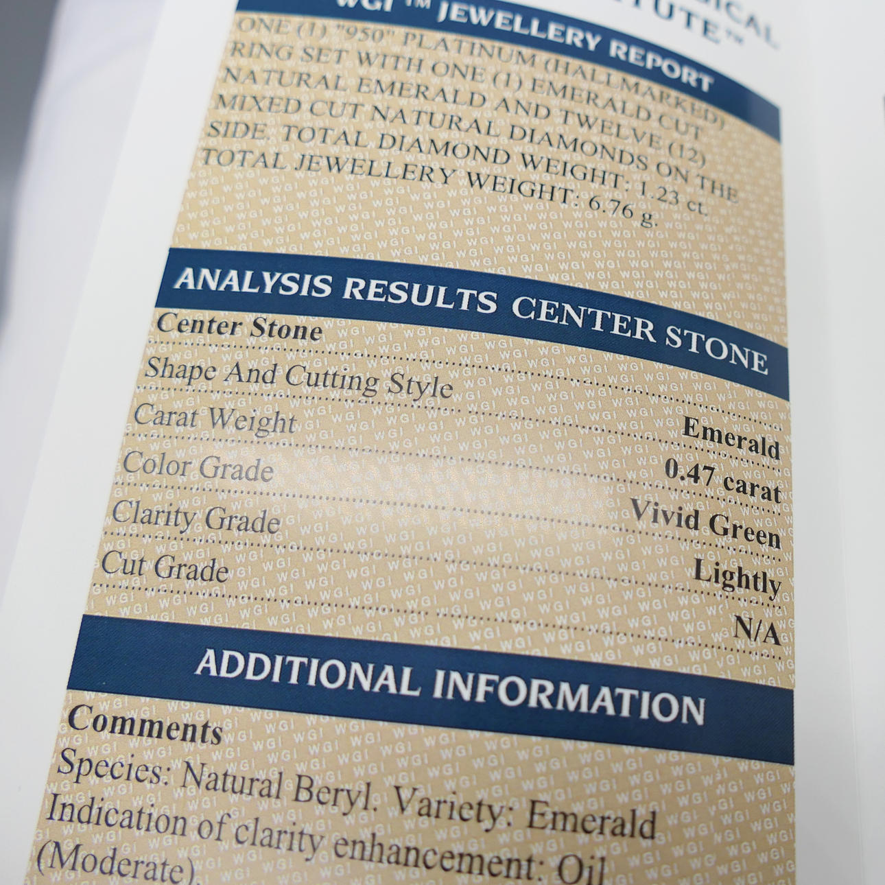 • Emerald: natural; emerald; 0.47 carats; vivid green colour; lightly included clarity; indication of clarity enhancement (oil)