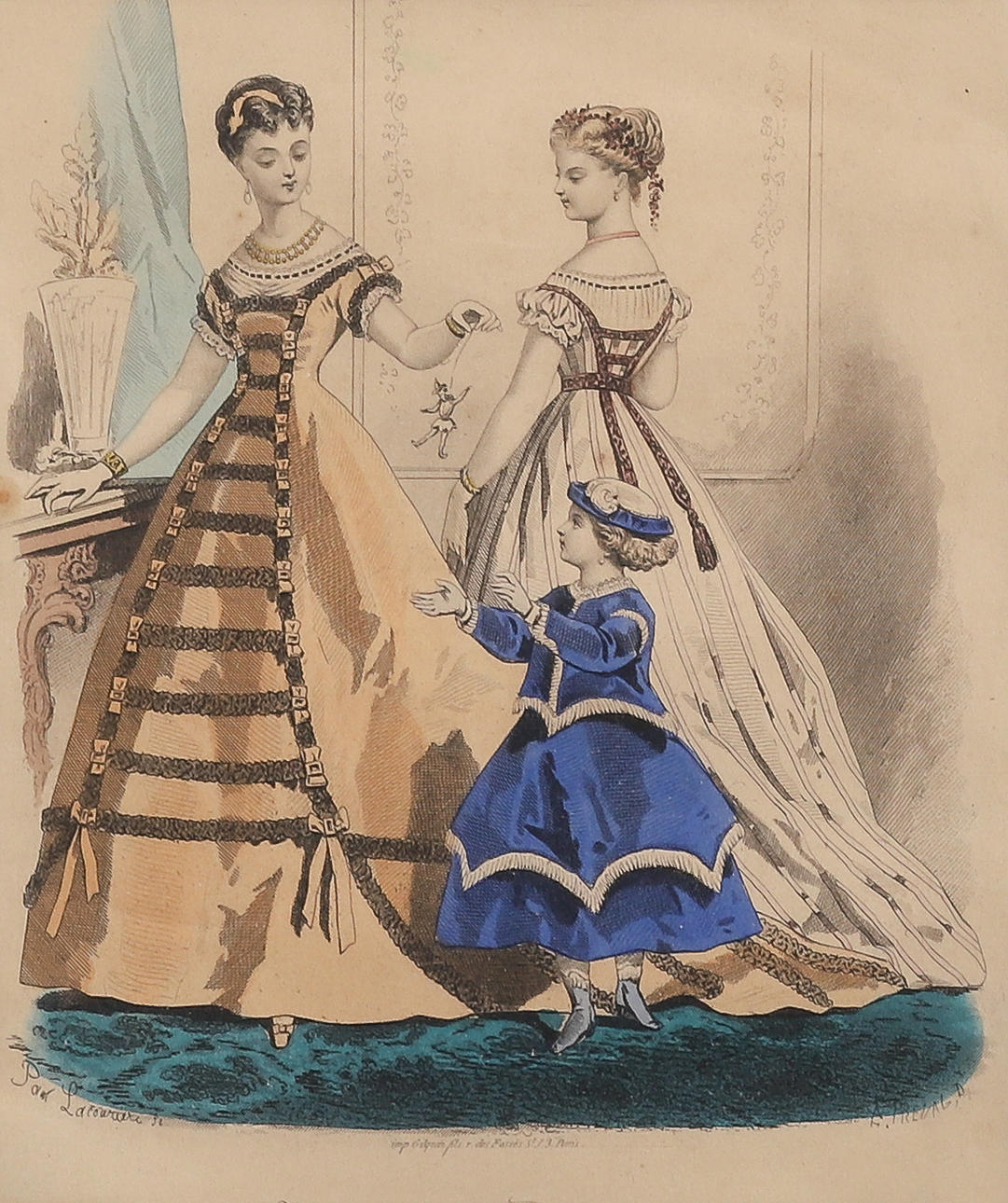 oil painting, scratched and marked, fashion plates and print, staining.