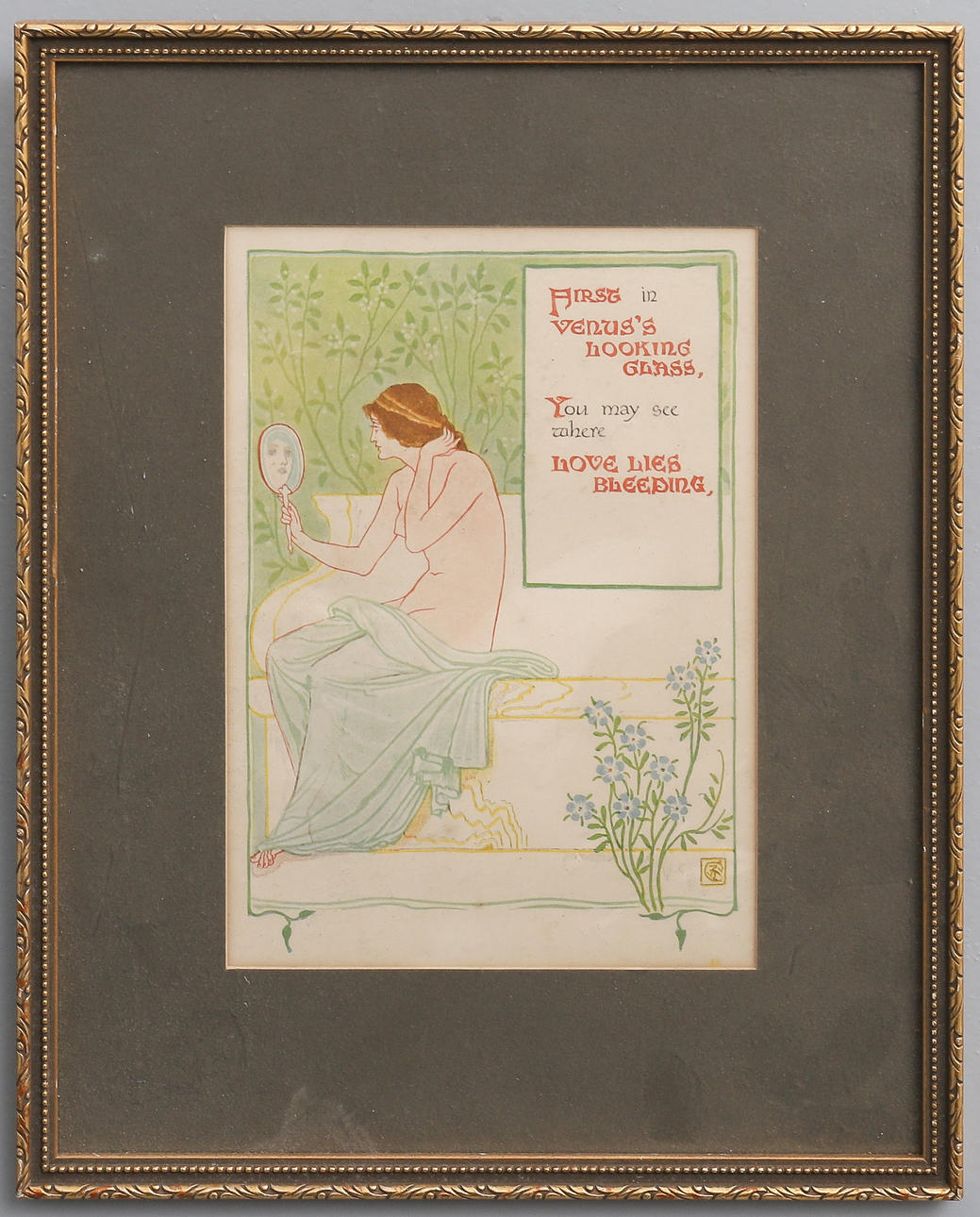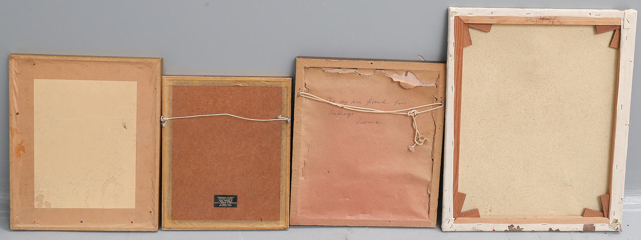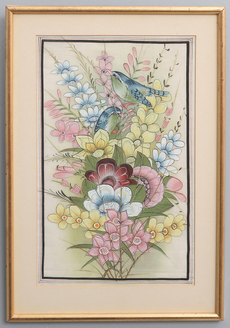 indistinctly signed, oil on canvas, 51cm x 41cm, unframed, two French 19th century fashion plate engravings, later mounted and framed, 38 x 30cm and 38 x 33cm overall, and a coloured print - First In Venus's Looking Glass, mounted and framed, together with Katie Gilddon (1883-?), Still Life of Flowers including Fritillaries, signed and dated 24-8-45, watercolour, 26cm x 21.5cm, original mount and frame, 51 x 41cm overall, remains of hand written label verso and label of 'J Bryce Smith Ltd, Exhibition Agents & Picture Framers ...', a modern still life of flowers and two birds, gouache on material, mounted and framed, 47 x 32cm overall, and Rabbit Shooting - a modern coloured reproduction after Samuel Howitt, mounted and framed, 48 x 59cm overall (7).