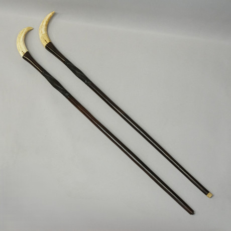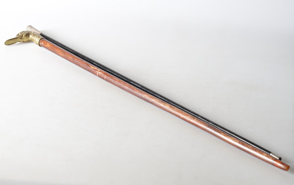 2593472. WALKING STICKS, 4 pcs, of which 2 with handles in silver, the other two in brass in the shape of a duck's head and a tree trunk, one stick with a bell, 1900s.
