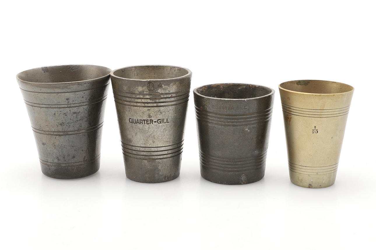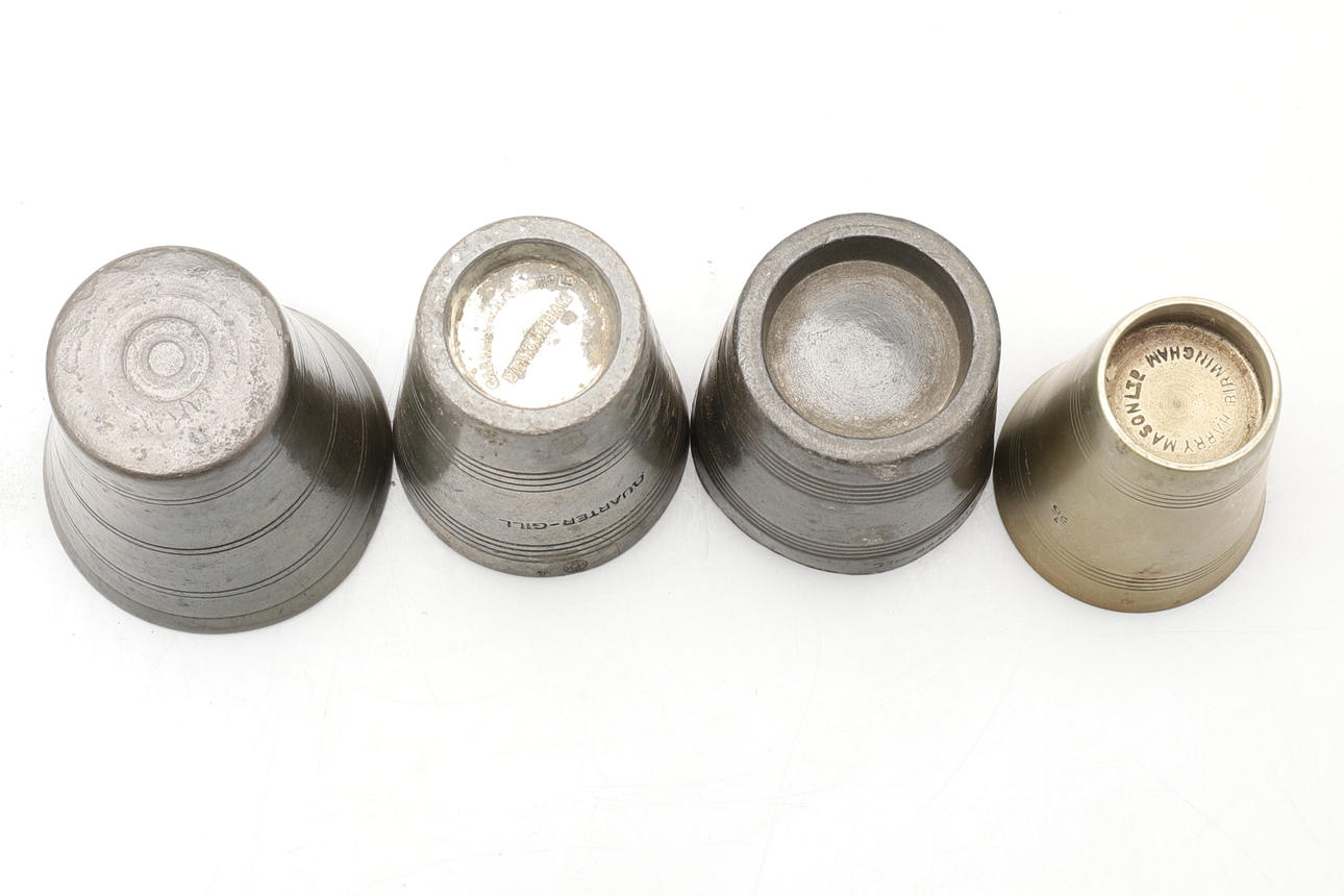 four pewter measures of similar sizes tallest 5.5cm tall.