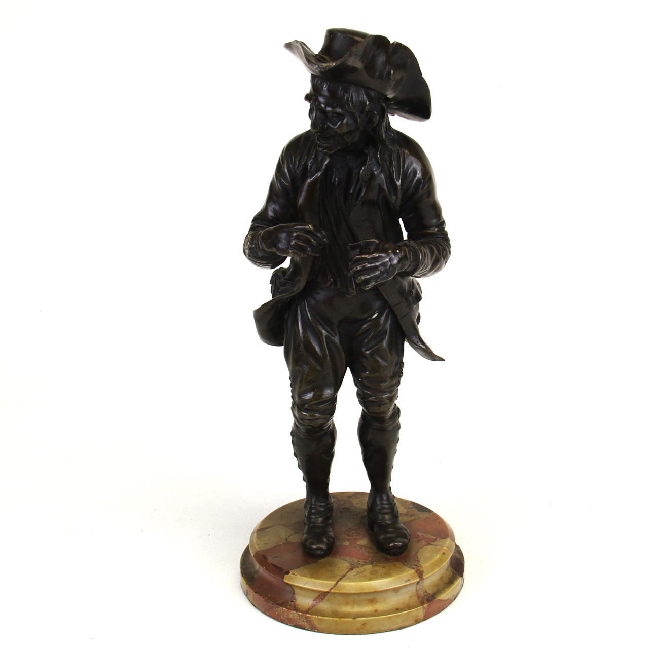 A pair of early 19th century French bronze figures on polished stone bases, H. 36cm.