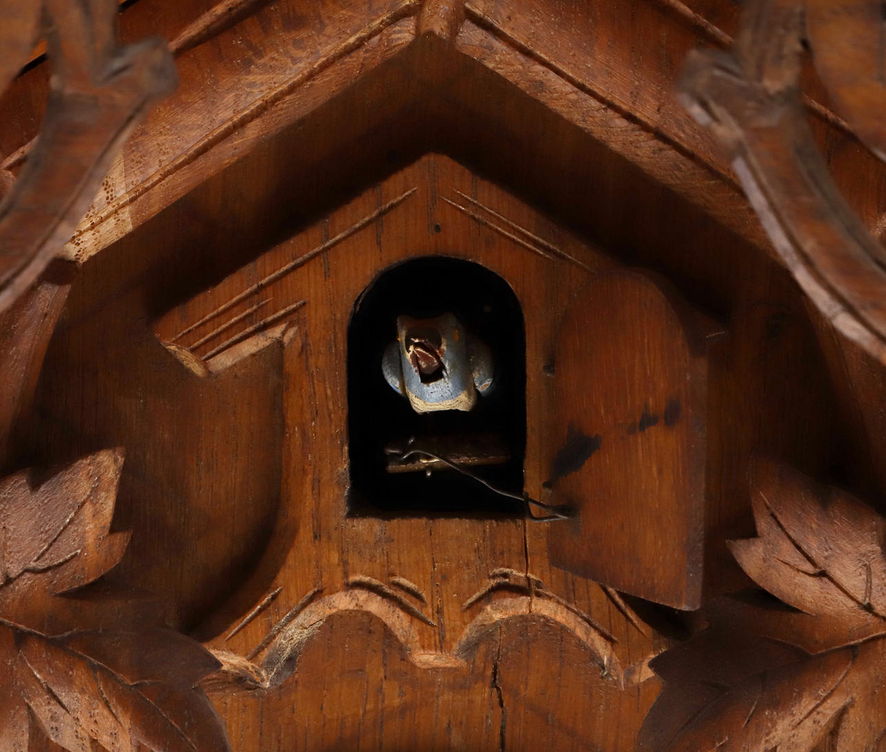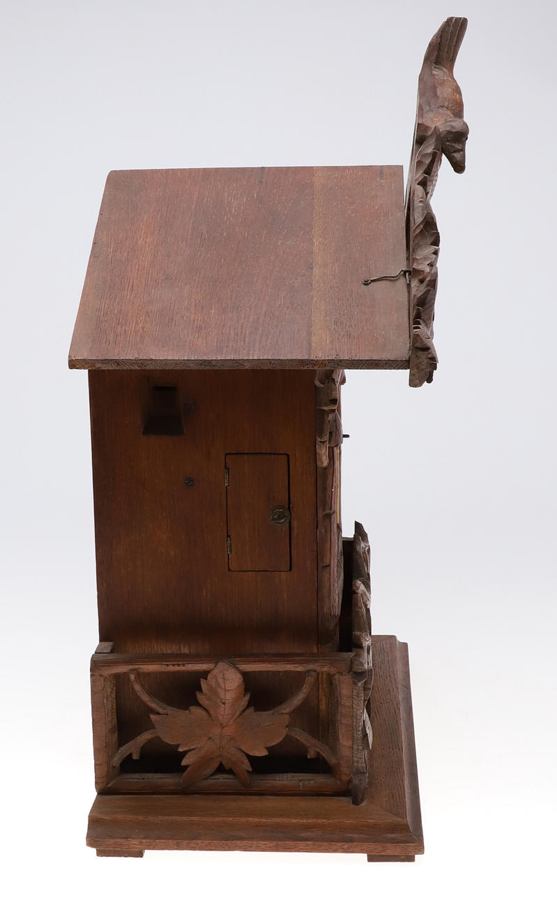 Late 19thc, the 5 1/2inch dial with Roman Numerals on a brass 8 day repeating movement, half hour striking on a gong and automaton Cuckoo with twin bellows. The oak case with bird and leaf pediment, with a pendulum and key. 57cms high, 37cms wide.