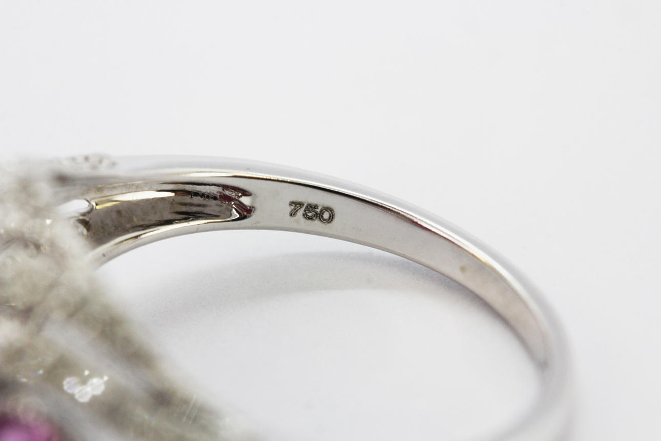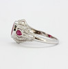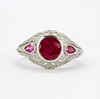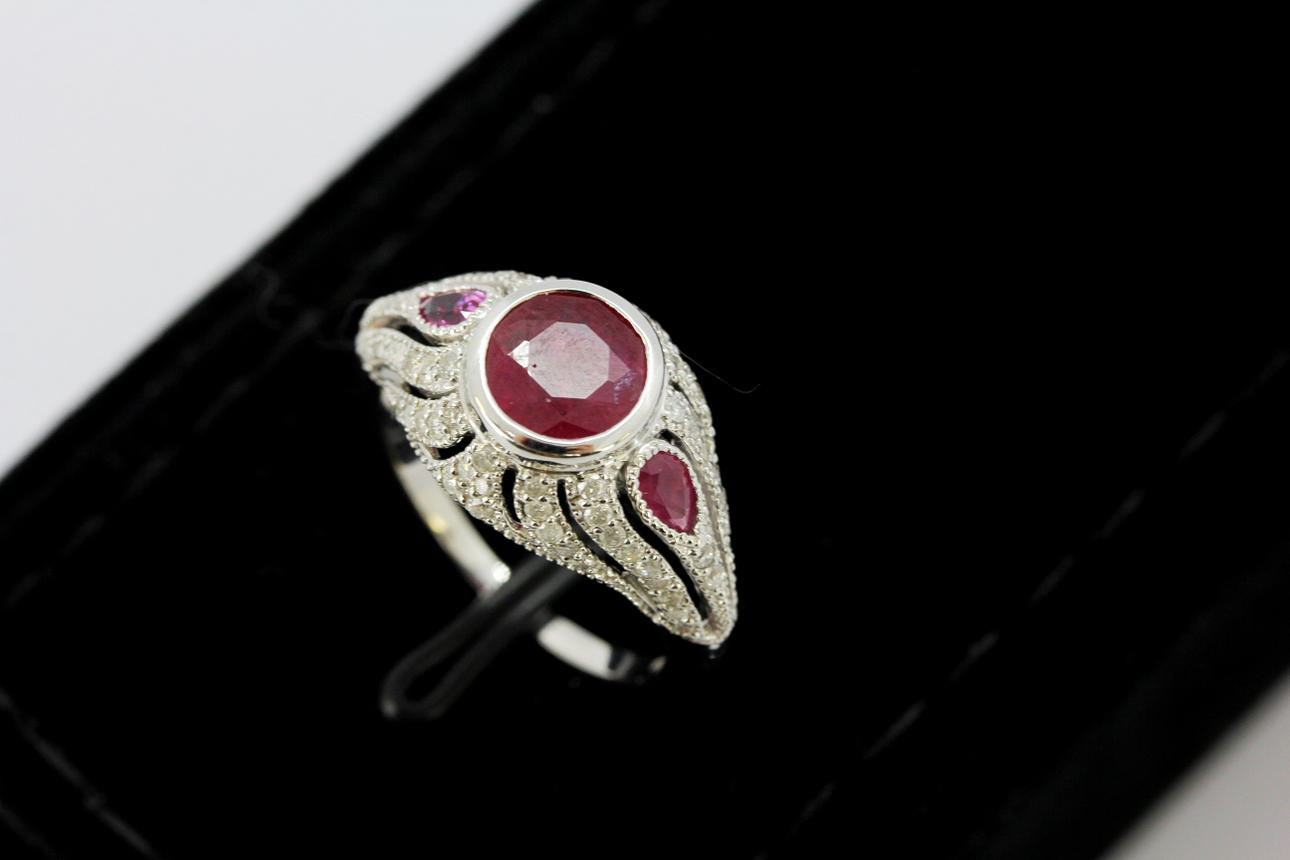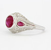 An 18ct white gold (stamped 750) ring set with a round and pear cut rubies and diamonds, (one pear cut ruby replaced), (K.5).