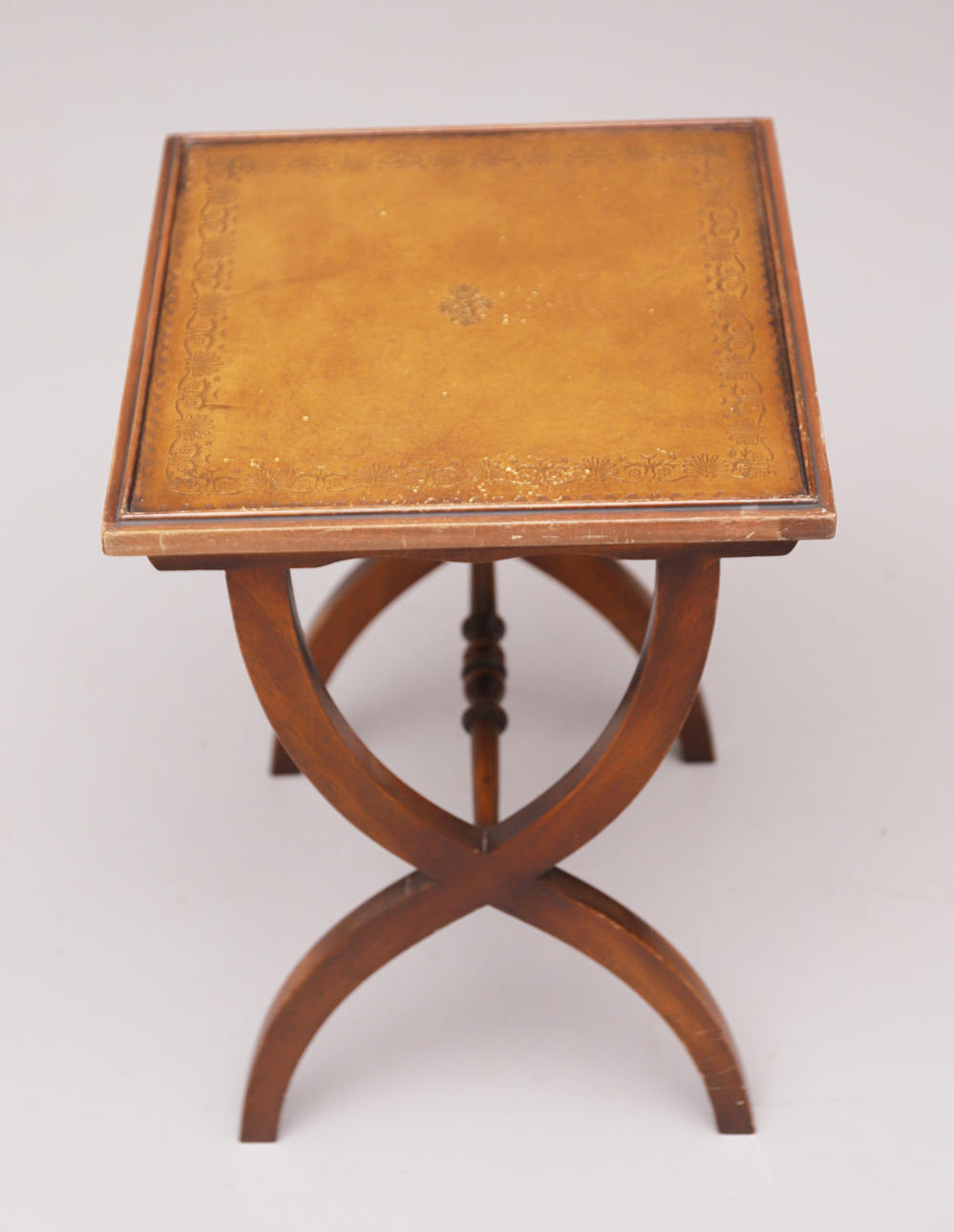 ENGLISH STYLE SIDE TABLE WITH RUSSIAN LEATHER TOP.