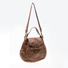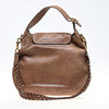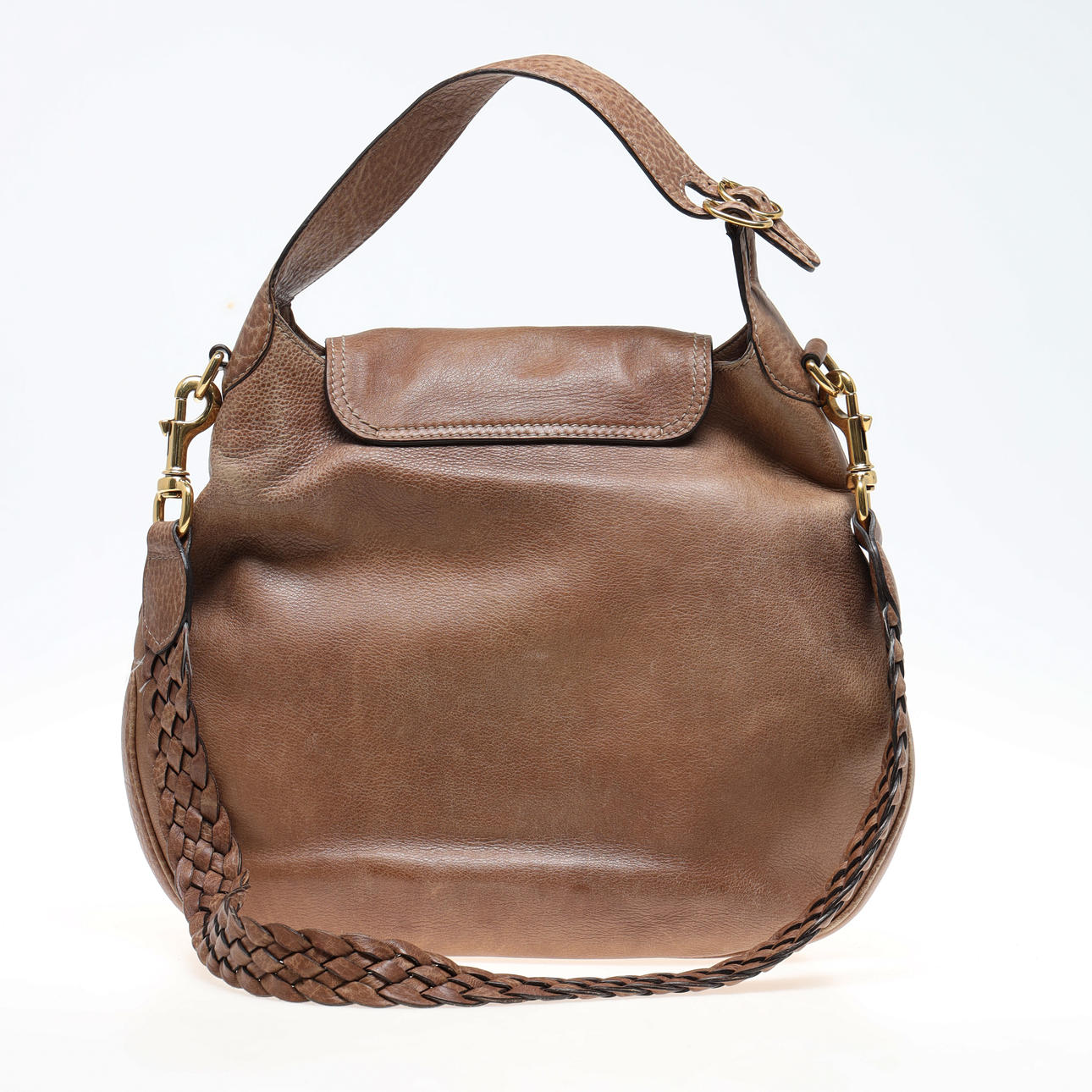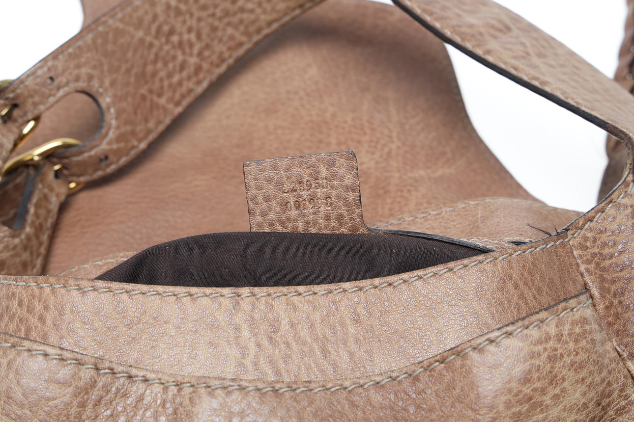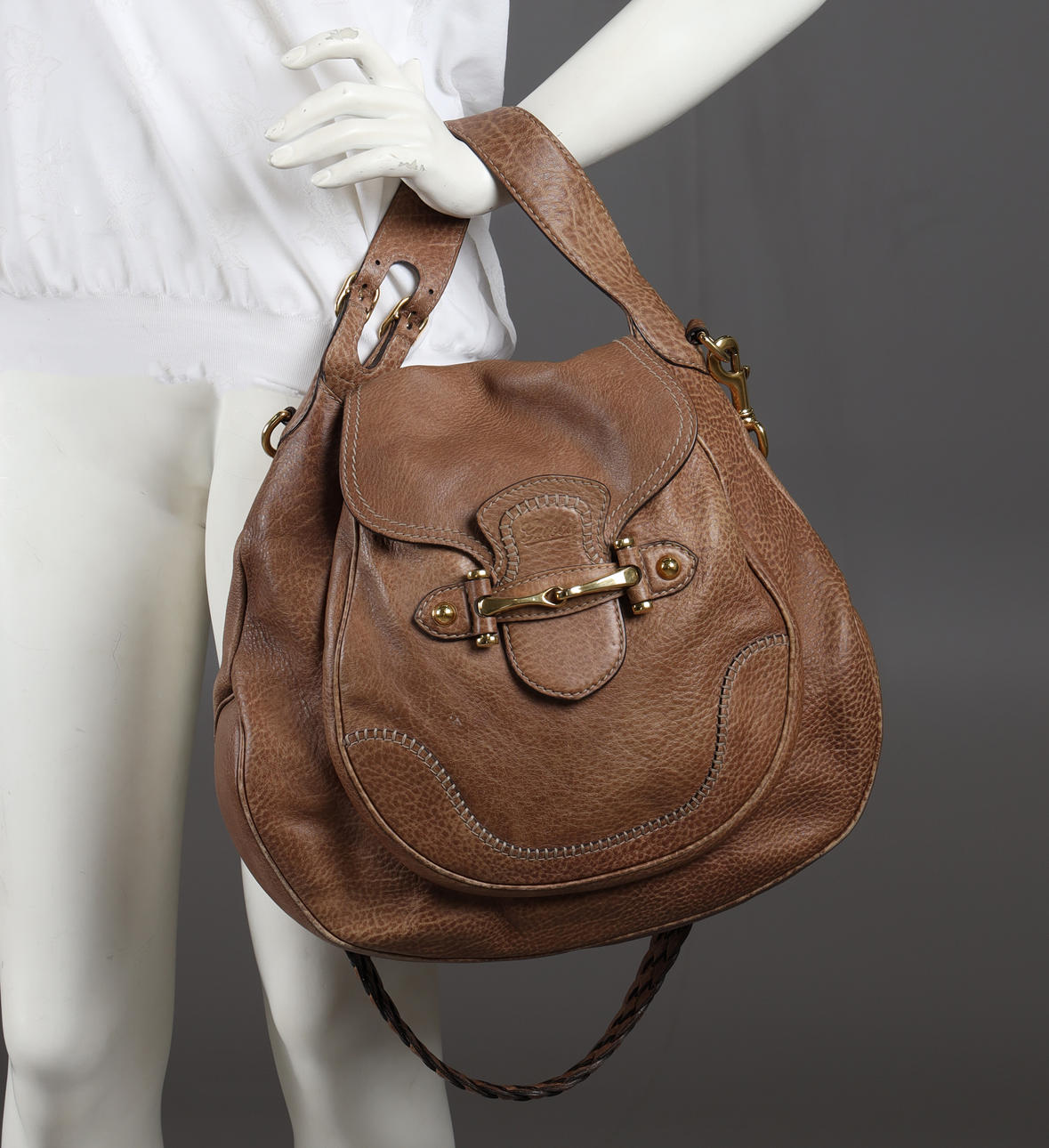 Shoulder bag in brown leather with detachable braided shoulder strap and buckles in yellow metal. One external compartment, bag with cover and lined inside with zipped side compartment. Labeled and label with embossed stamp. Gucci and serial number.