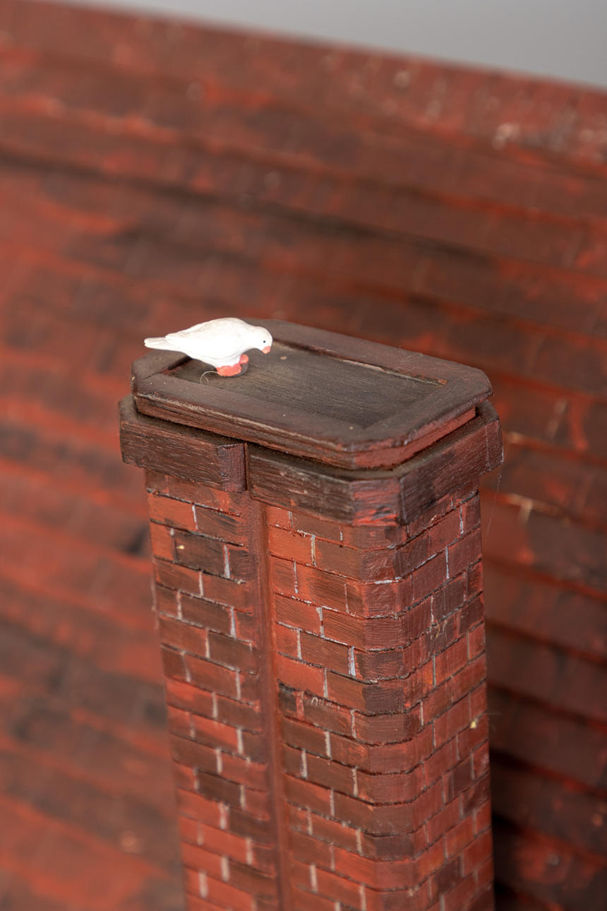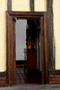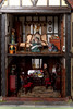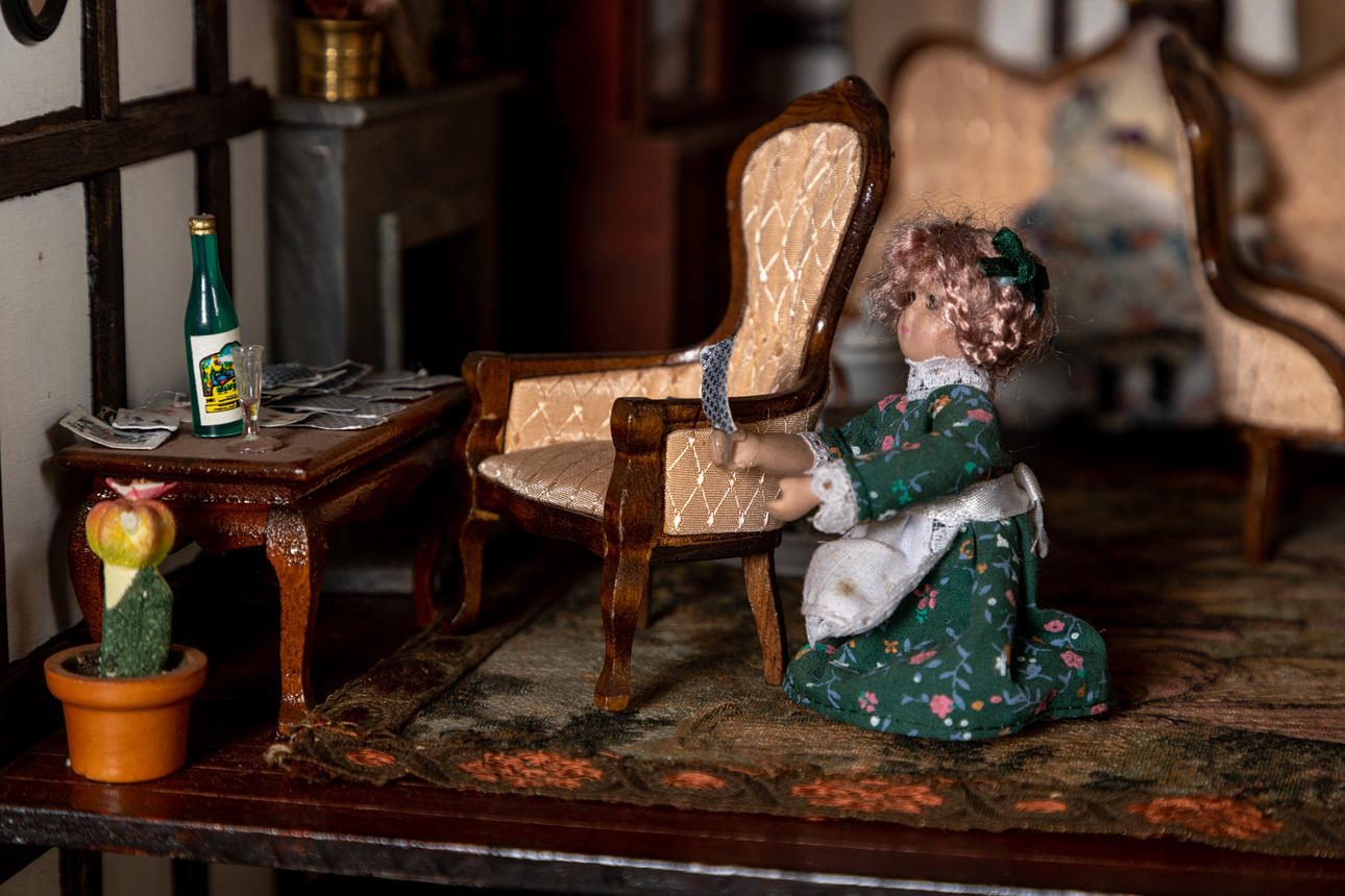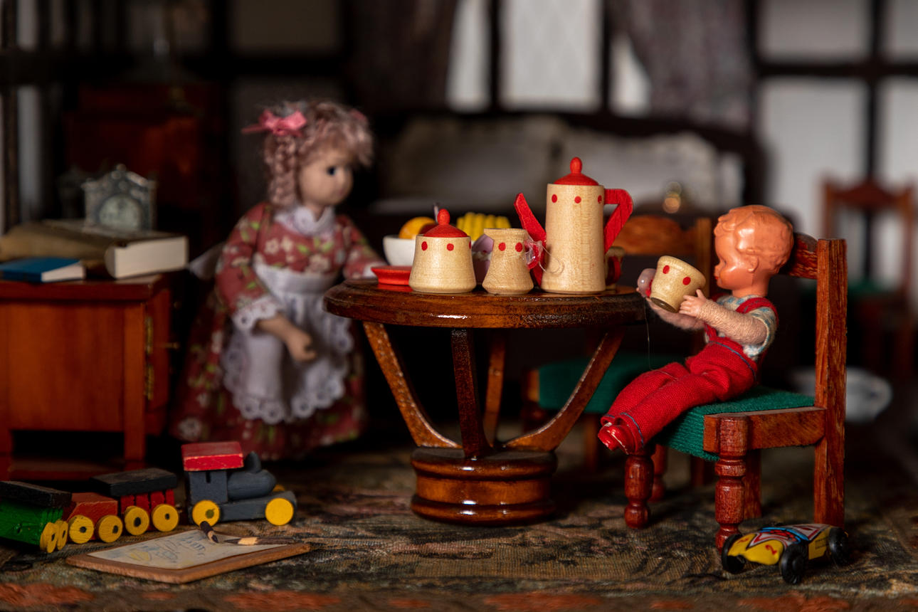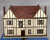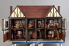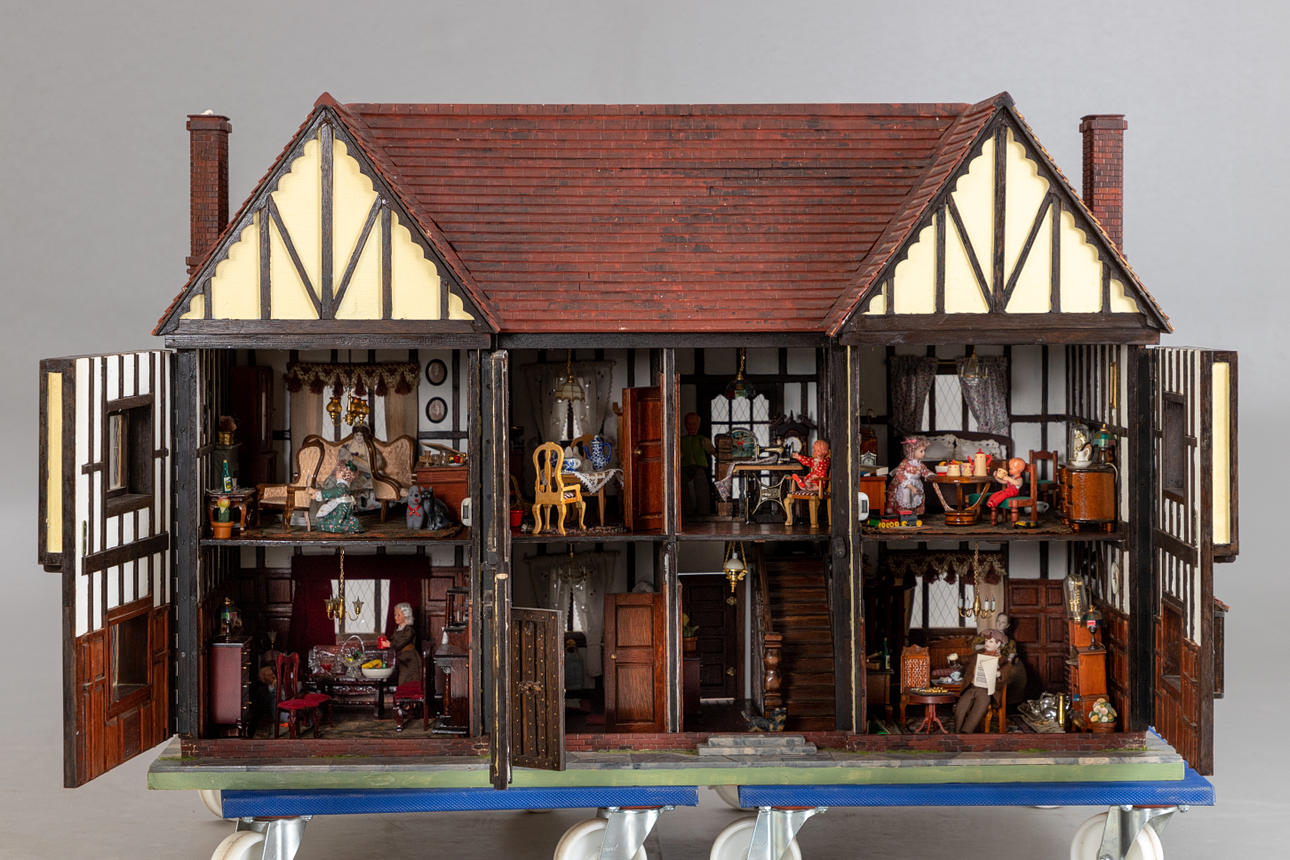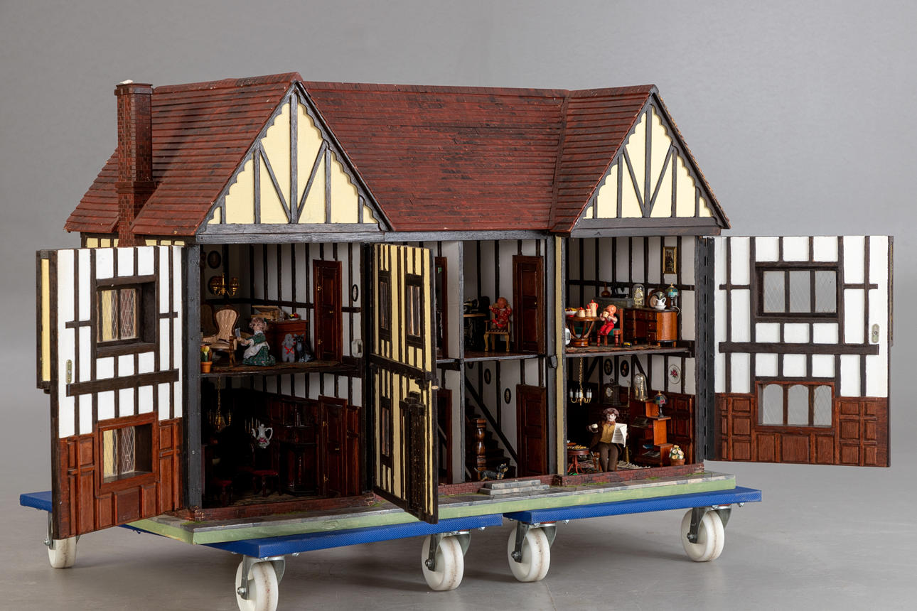 Large English-style Tudor House dolls house, ca. 1960/70s made of wood. The house is divided into three parts and can be opened to the front via three large doors. In the left area there are two living rooms, in the right area there is also a living room and a bedroom. The middle area consists of dining room and bathroom as well as a staircase over two floors. The attic is not developed. The interior is very elaborate and detailed. Furnishings are moveable. dimensions approx.: H.: 73 cm, W.: 110 cm, D.: 52 cm.