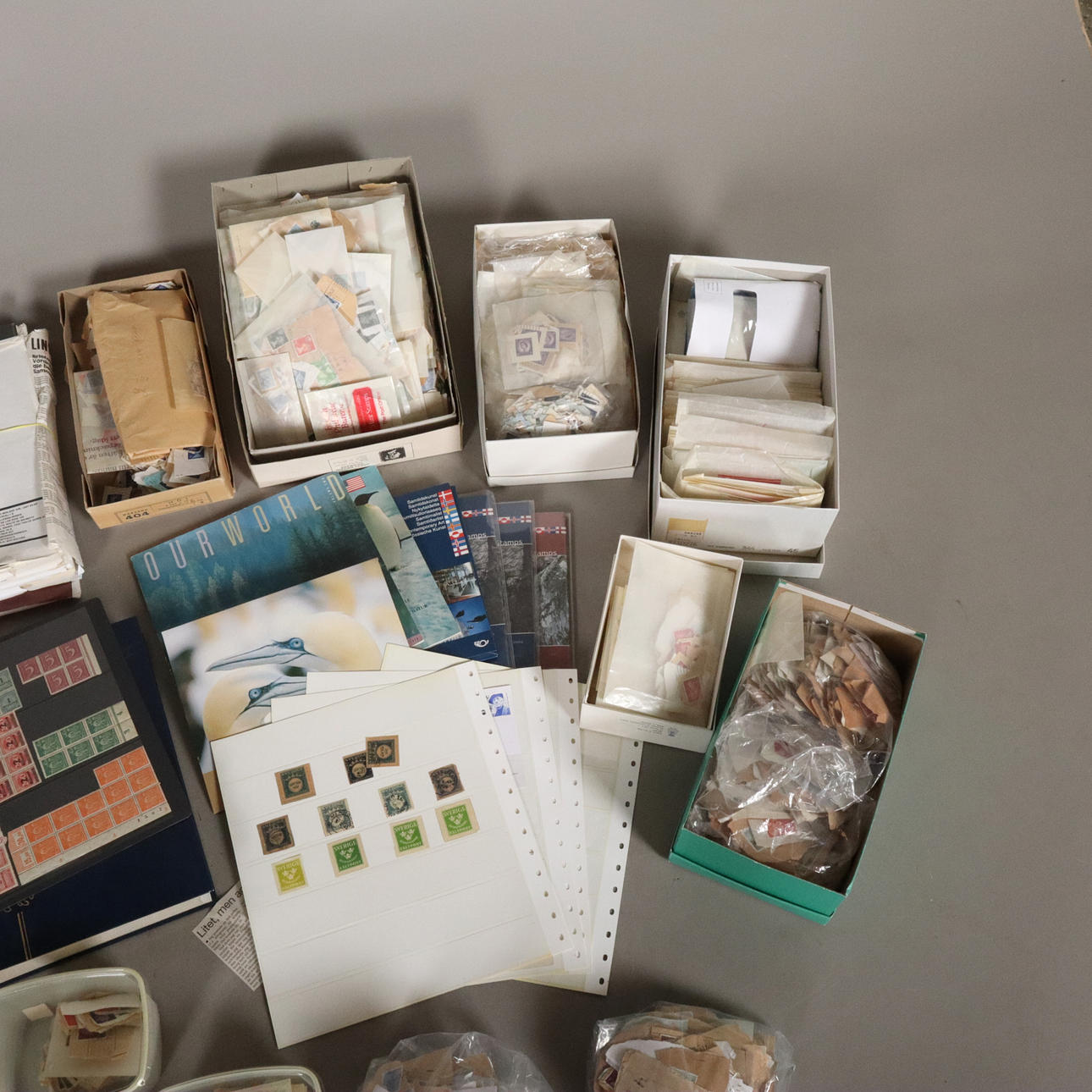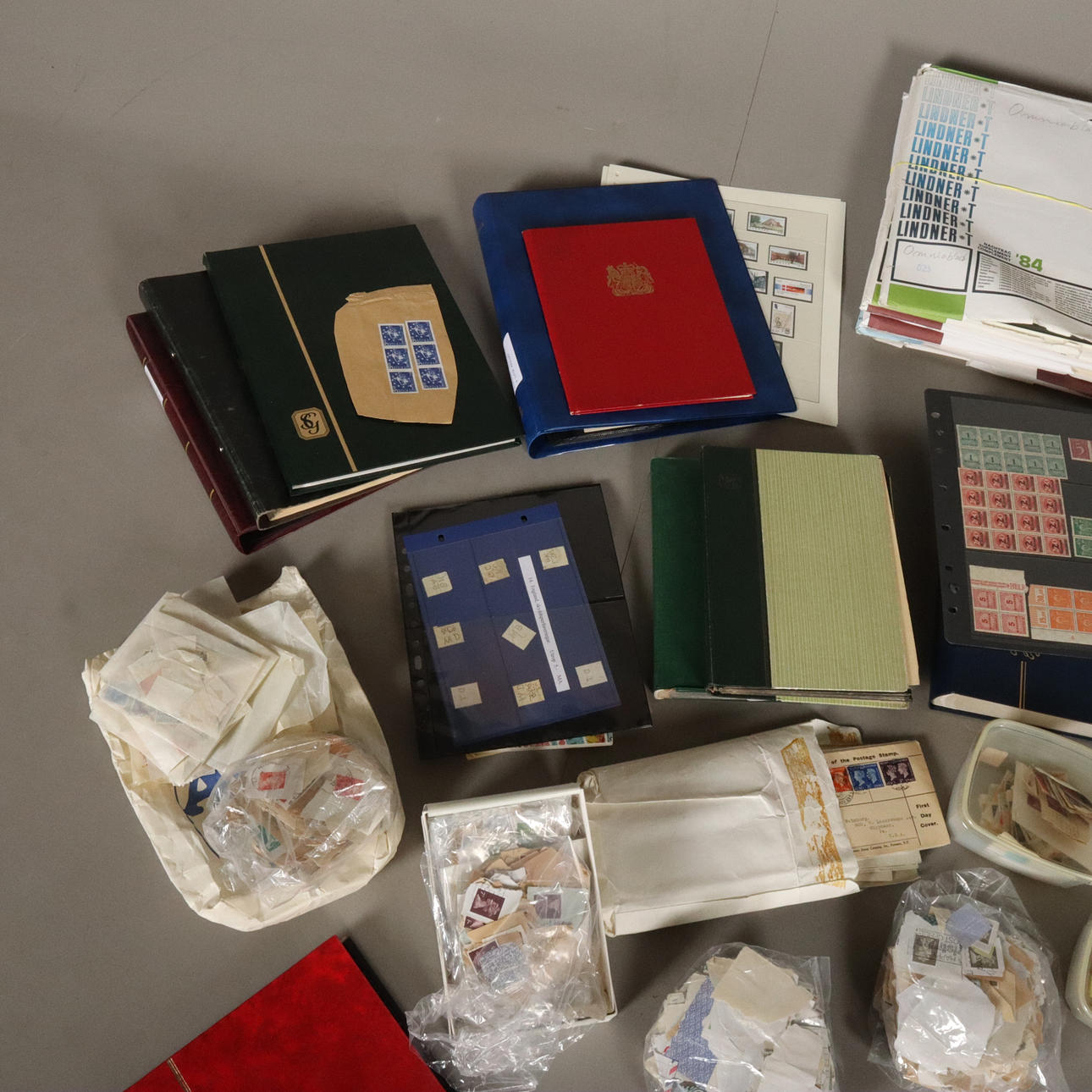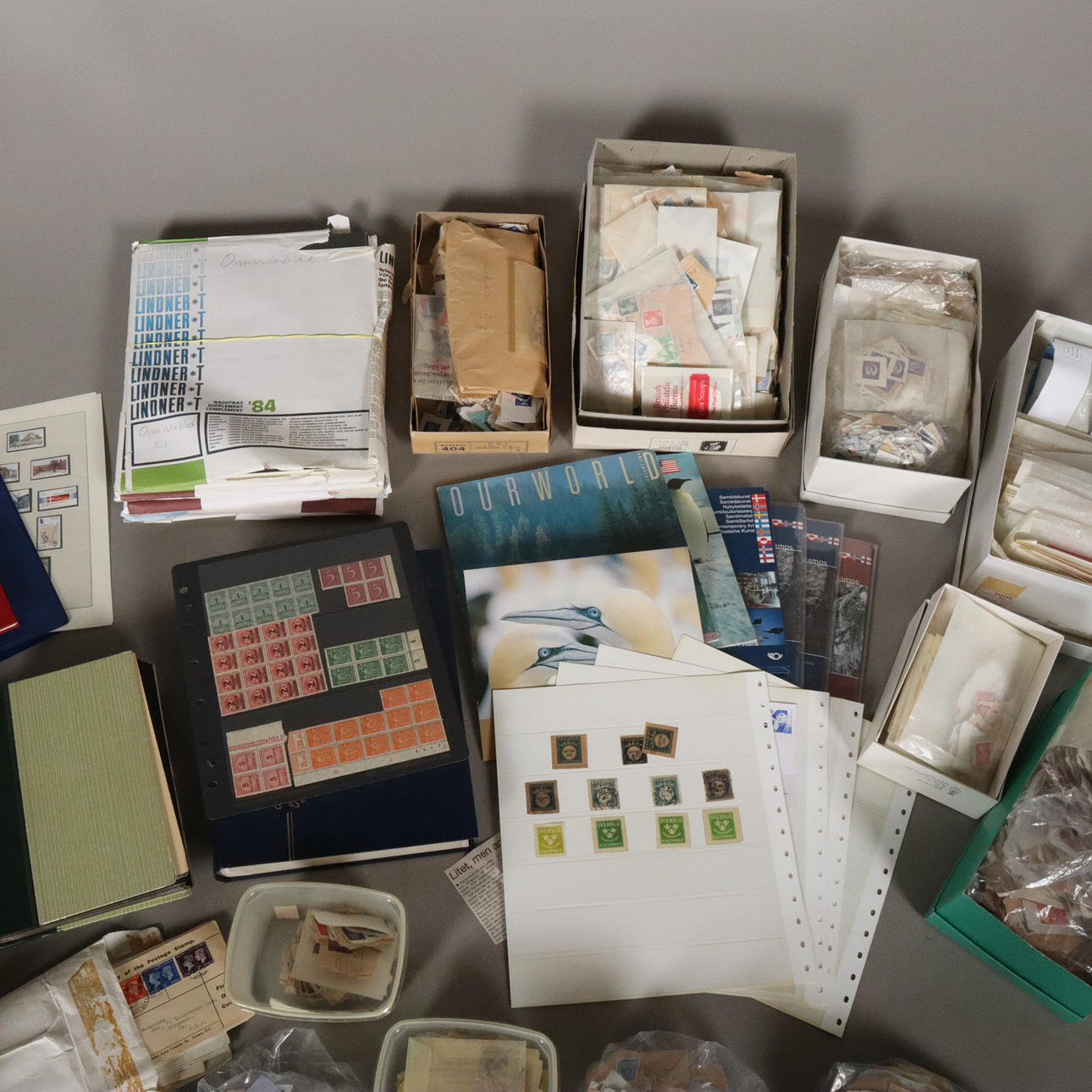 unsorted in albums and stamps on envelopes etc. 1 unused album and unused lidner sheets included.