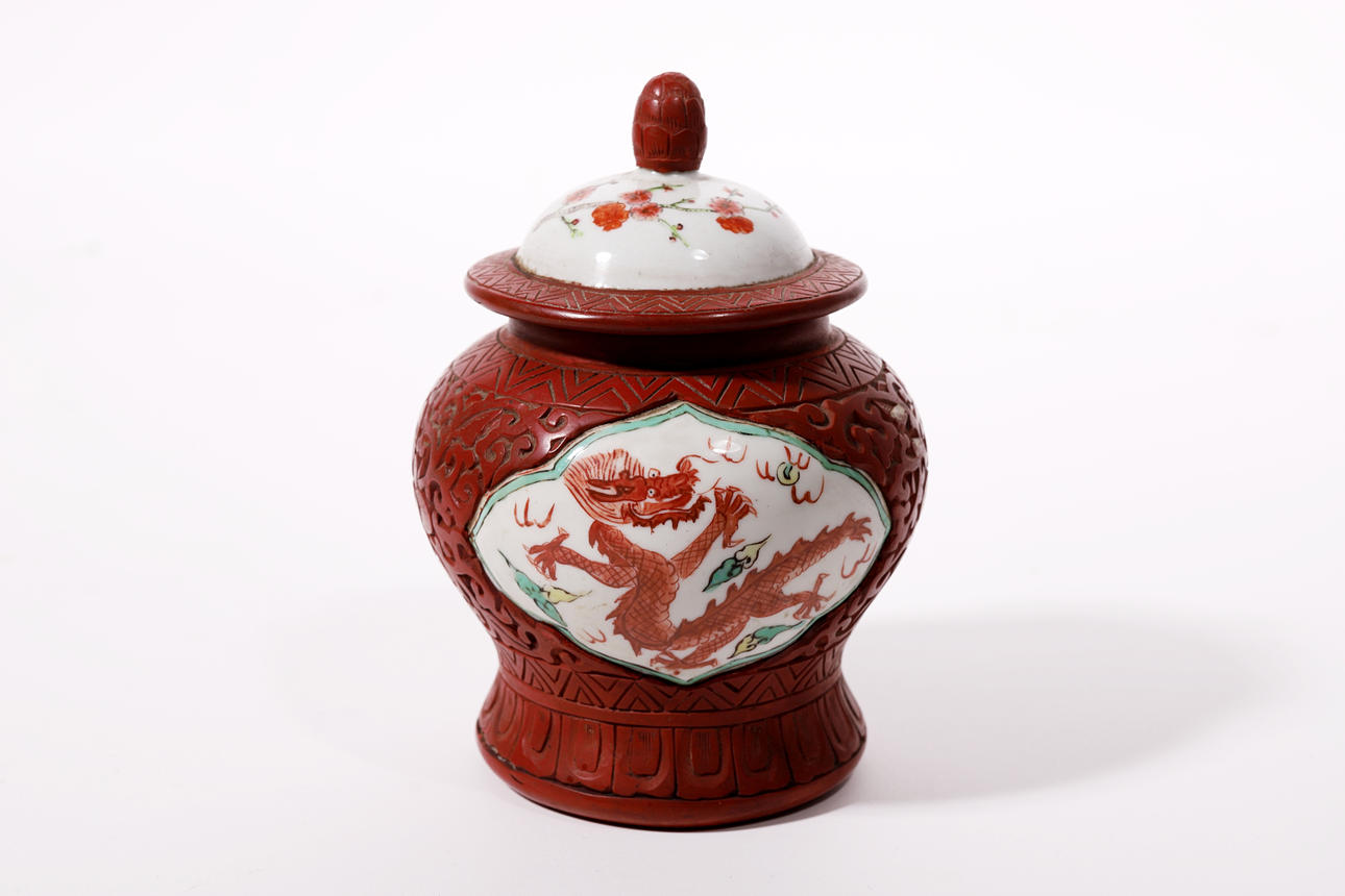 With enameled dragon motifs, covered with worked Chinese lacquer.