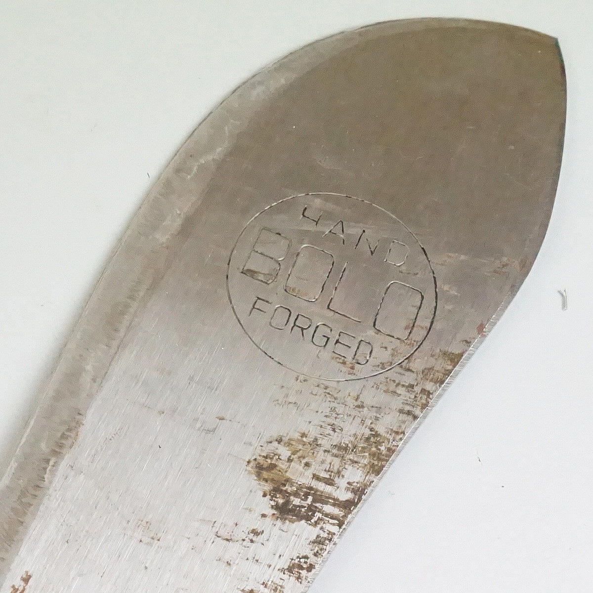 Stamped "Hand Forged Bolo", Green canvas case included, marked Made in Japan. Length approx. 50 cm including handle, blade length approx. 37 cm.