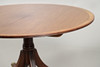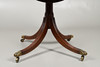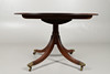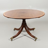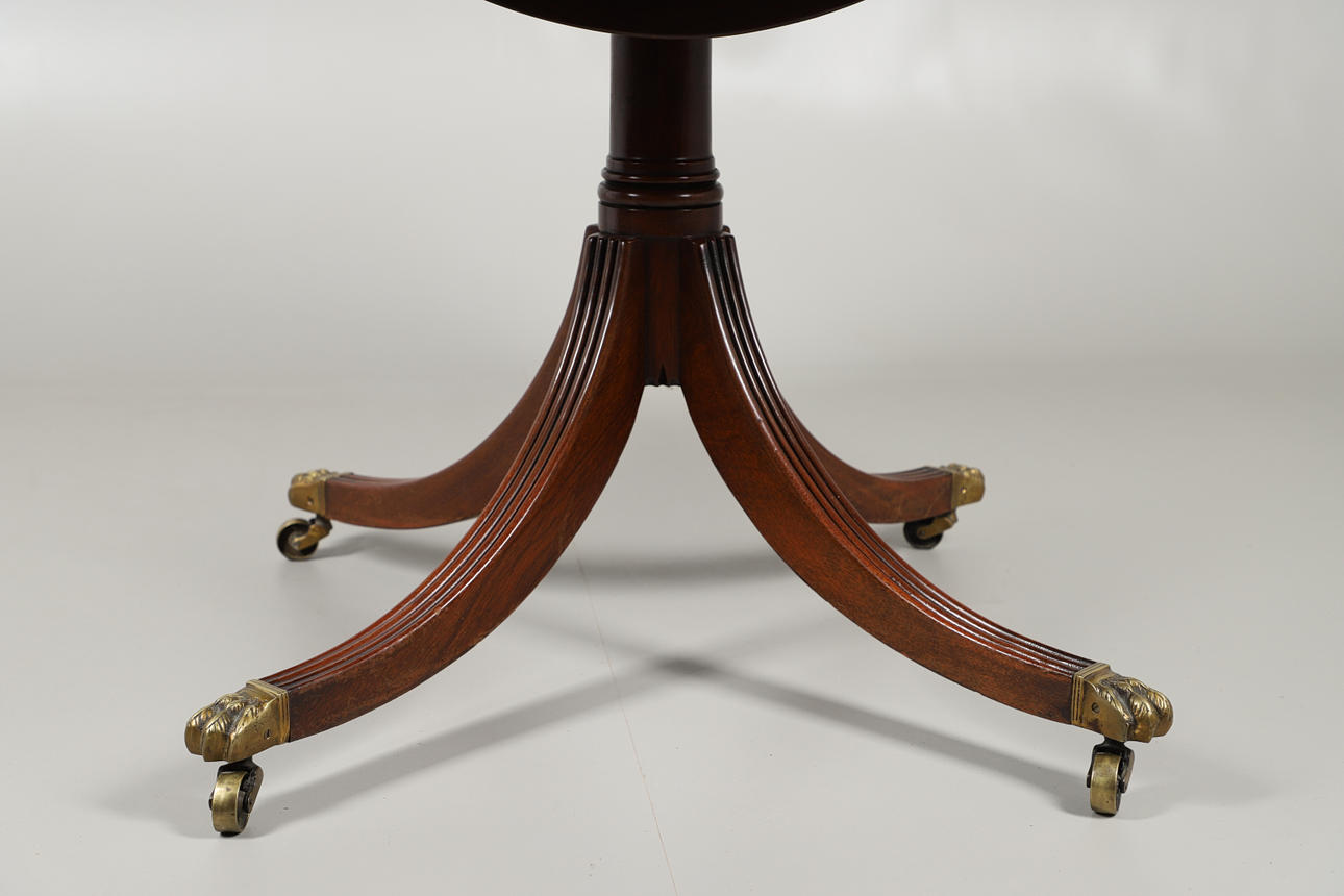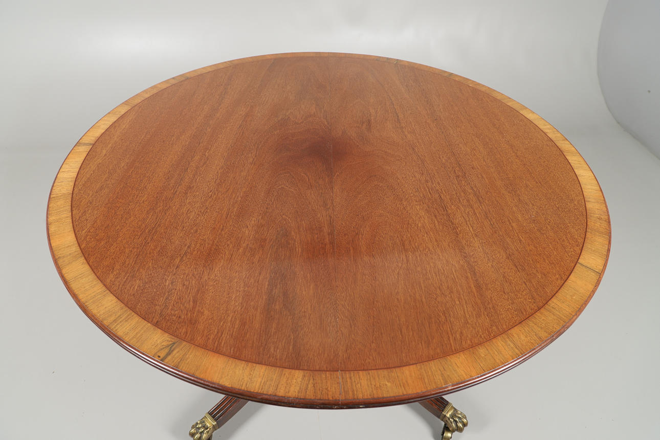 A round tilt top mahogany breakfast table, with crossbanded inlaid design, sitting on quad legs and brass claw castors. All parts present. Height 75cm x Diameter 121cm.
