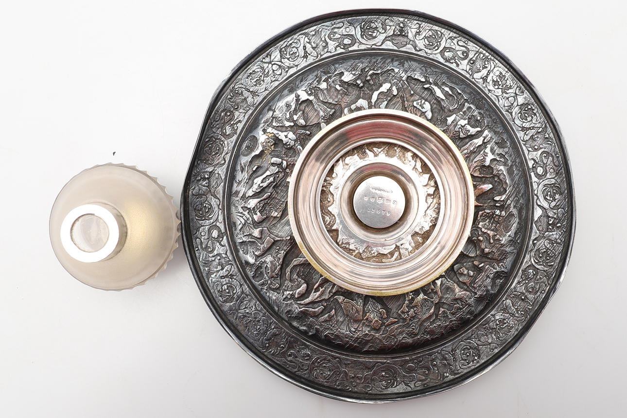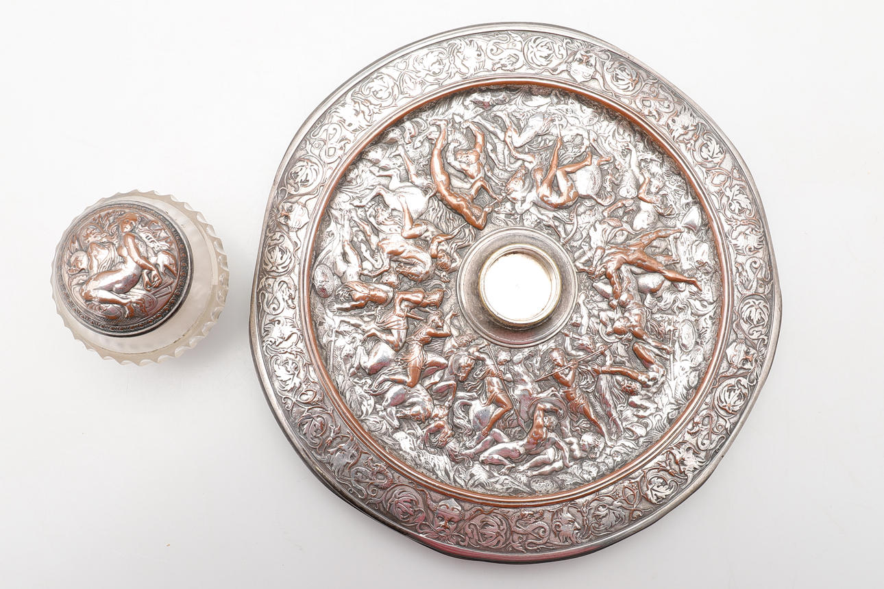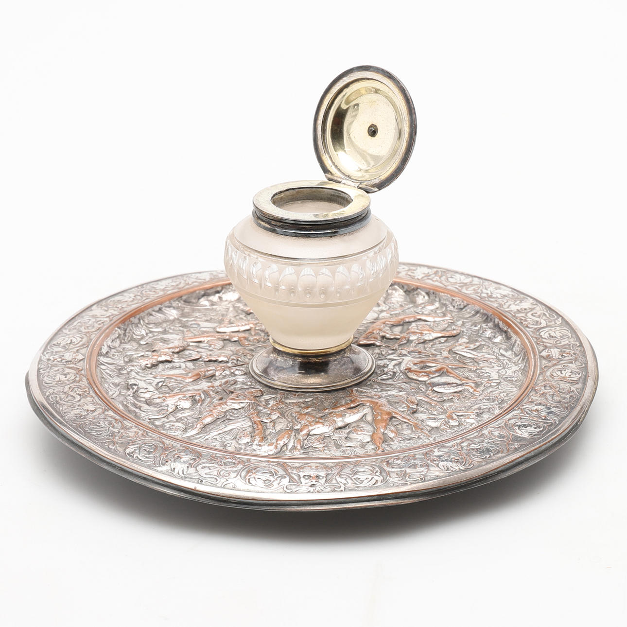 the cut glass inkwell, with hinged cover on circular dished stand, decorated with a classical battle scene,