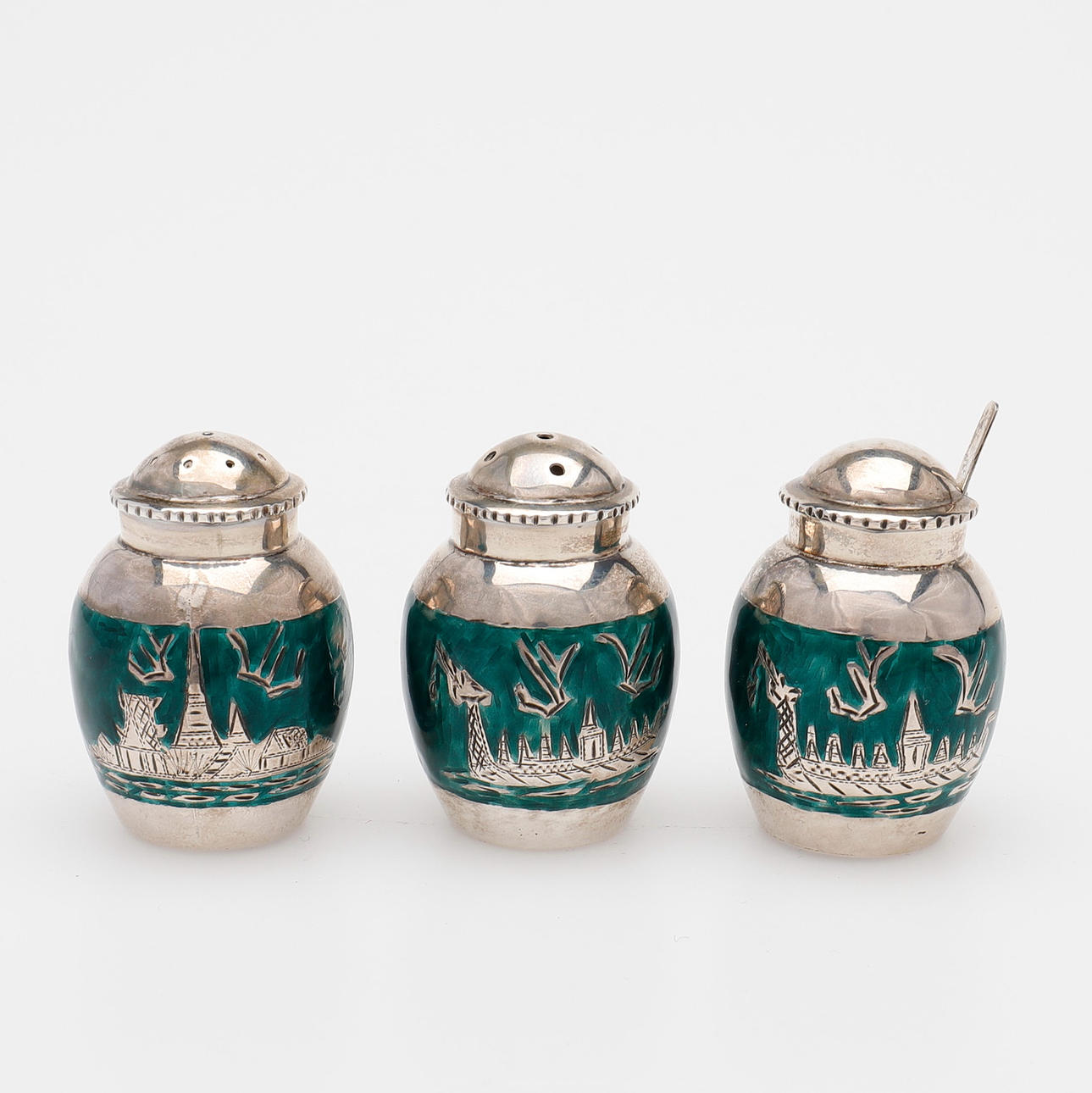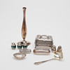 Two boxes, box, bowl, ladle, vase as well as a couple of sprinklers and a three-piece condiment set. Import stamps, weight 462 grams excluding vase with filled foot.