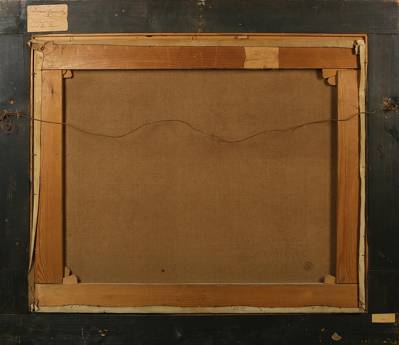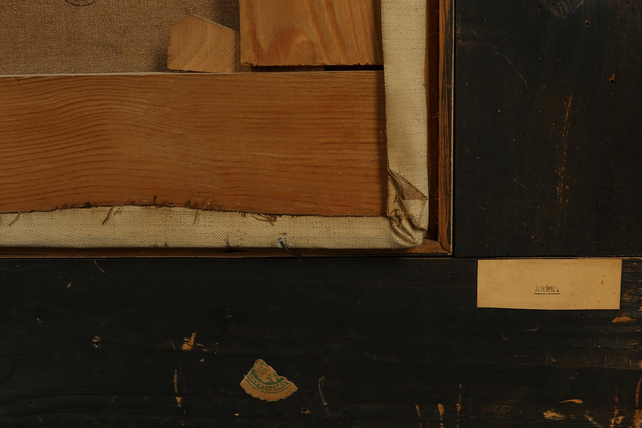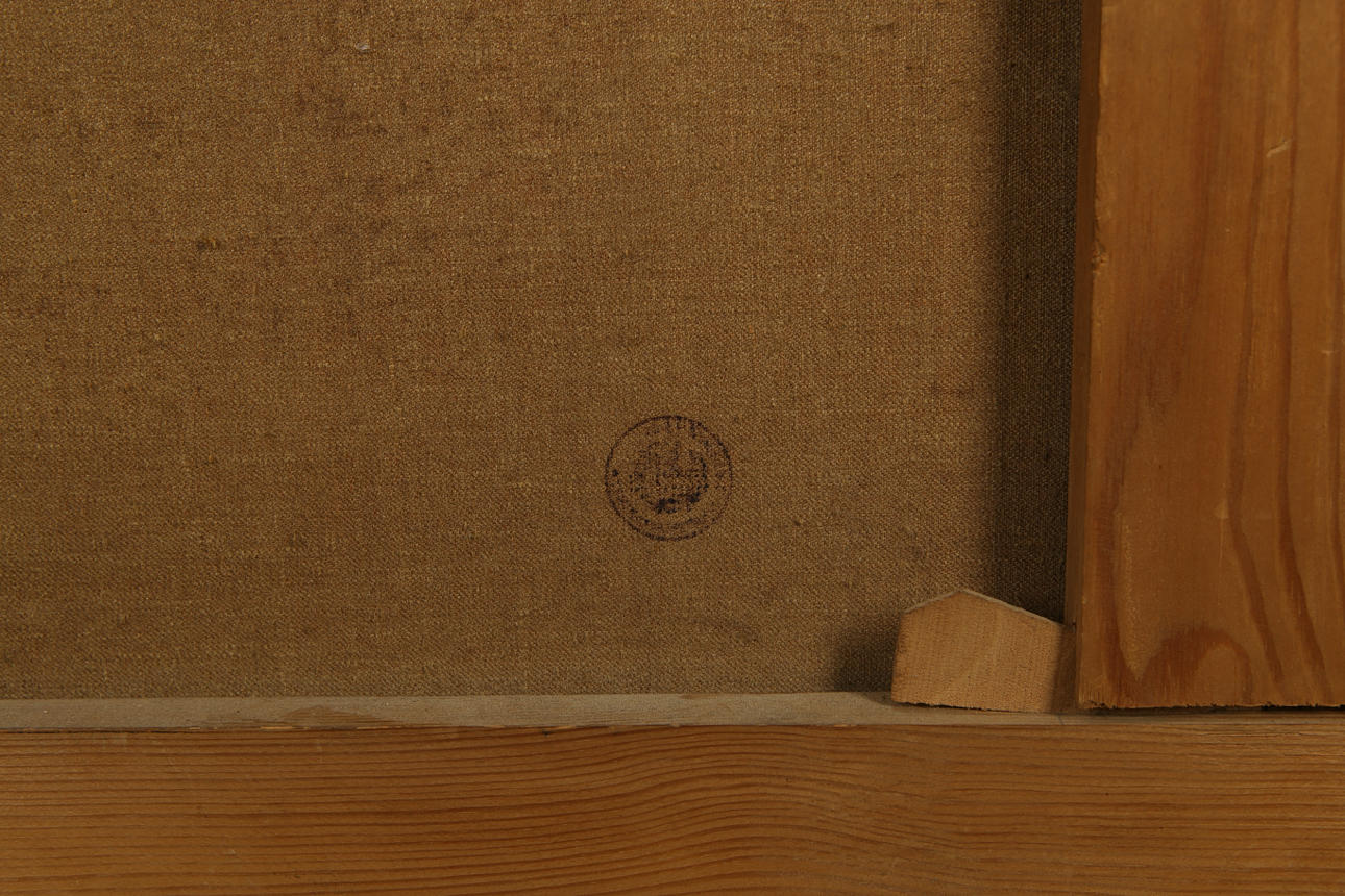 The frame bears remnants of paper labels and a stamp on the back from the exhibition and/or previous owner.